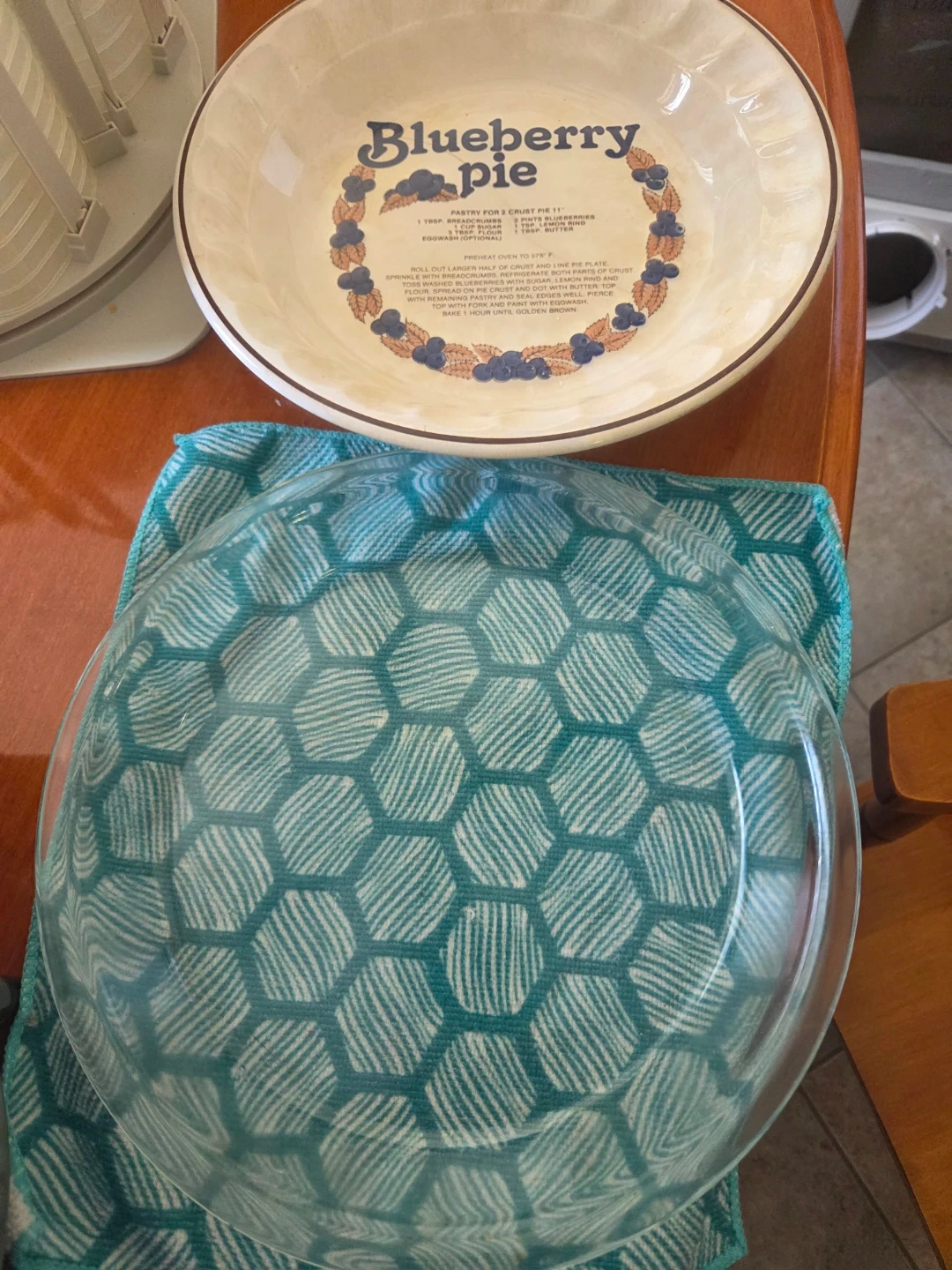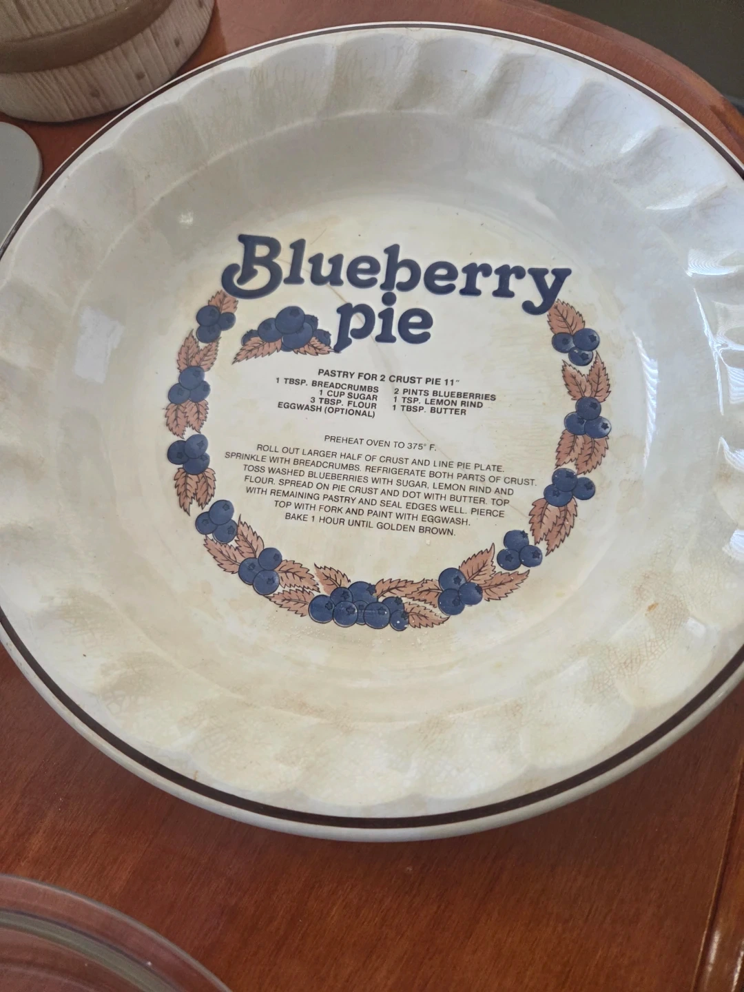 Ceramic pie plate that says "Blueberry Pie" on it, complete with a recipe! It's 11 inches in diameter. This plate is perfect for baking your favourite blueberry pie. Also Yrex clear pie plate