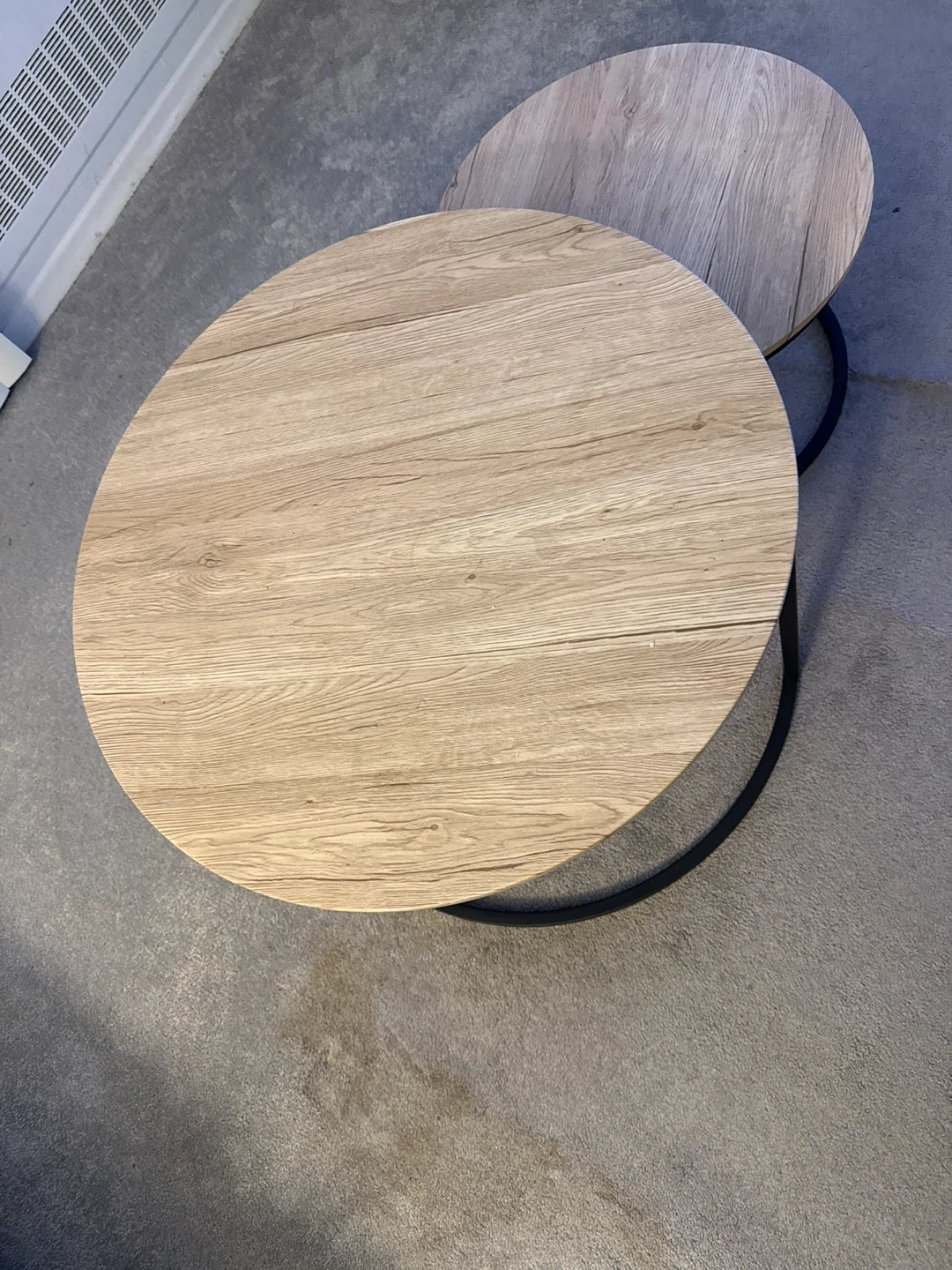 These round nesting coffee tables have a lovely wood look. They're perfect for adding a touch of style to your living room and saving space when needed. The tables are in great condition and ready for a new home!
