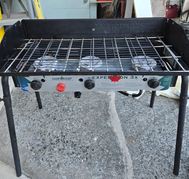 Camp Chef Expedition 3X stove. It features three burners for versatile cooking options.
