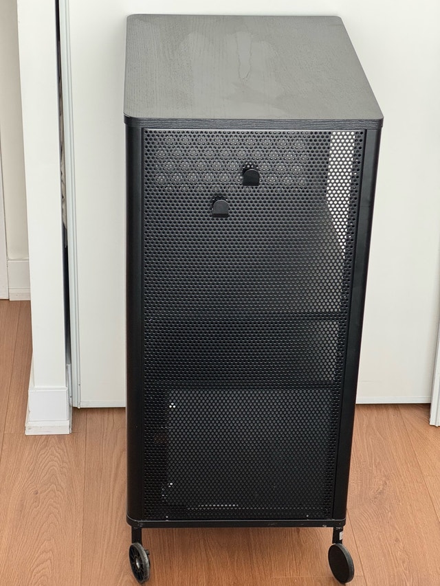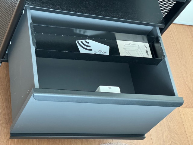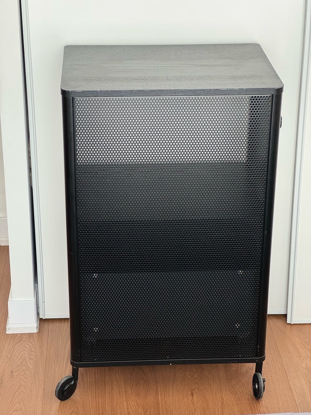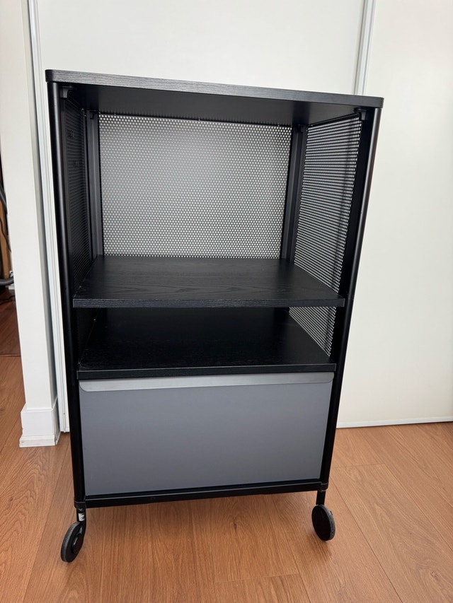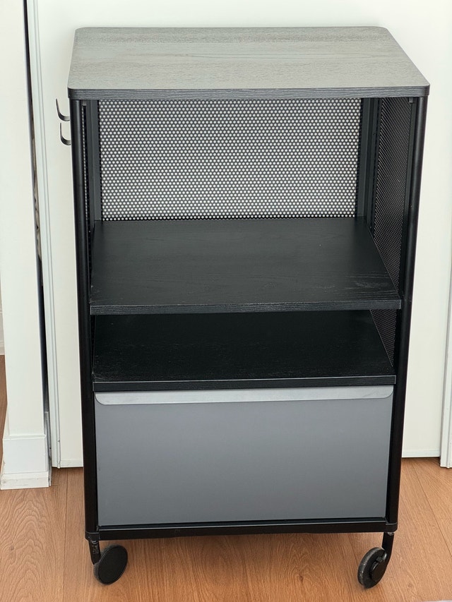 Tuck things away in your office or kitchen with this movable IKEA Bekant Storage Unit on Casters. It features adjustable hooks and a Rothult smart, keyless NFC/RFID lock for drawers. Dimensions are WDH 61x45x101 cm. Pickup in Wellesley & Sherbourne. Cash or e-transfer accepted. Ash veneer drawer and particle board drawer front. Includes floating drawer insert and wheels. Asking $99 or best offer.