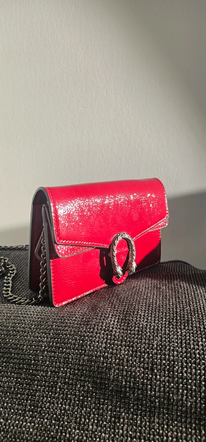 This is a shiny red patent leather wallet with a silver chain strap. It features the distinctive Dionysus tiger head closure. It's a compact size, suitable for carrying essentials.