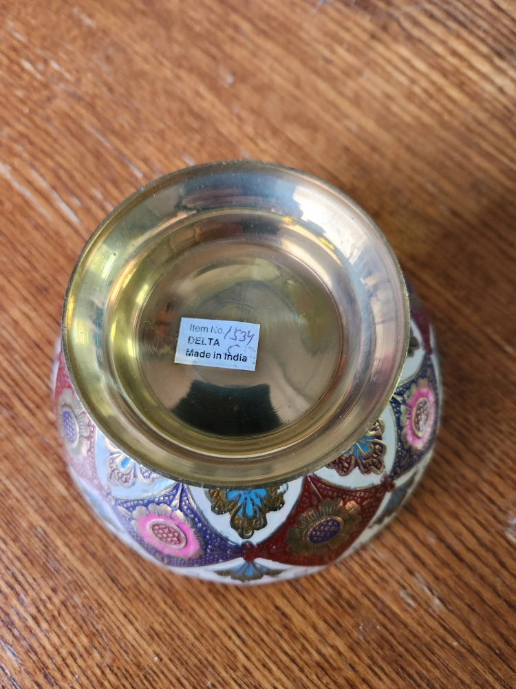 Small brass bowl with intricate floral design. White background with colourful details.