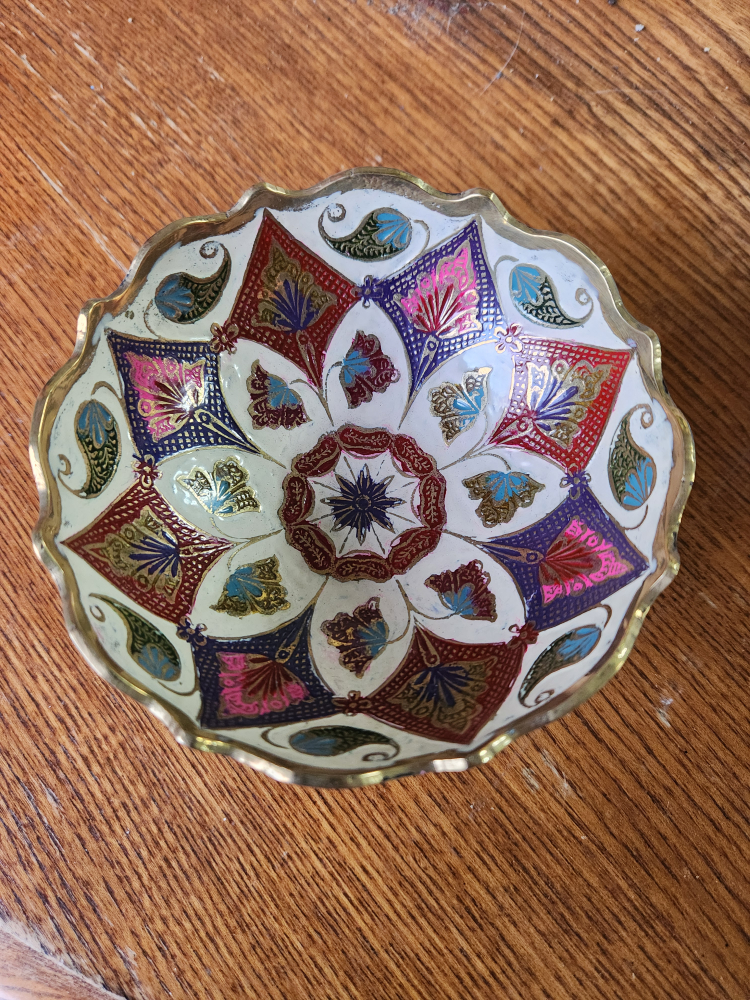 Small brass bowl with intricate floral design. White background with colourful details.