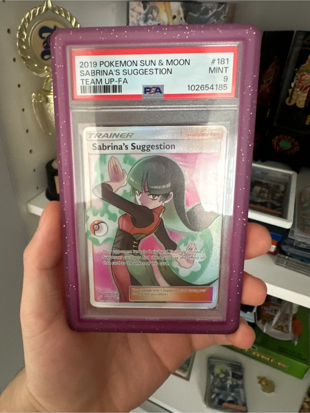 This is a 2019 Pokemon Sun & Moon "Sabrina's Suggestion" Trainer card, #181. It's graded Mint 9 by PSA and is part of the Team Up expansion. The card is housed in a protective PSA case.
