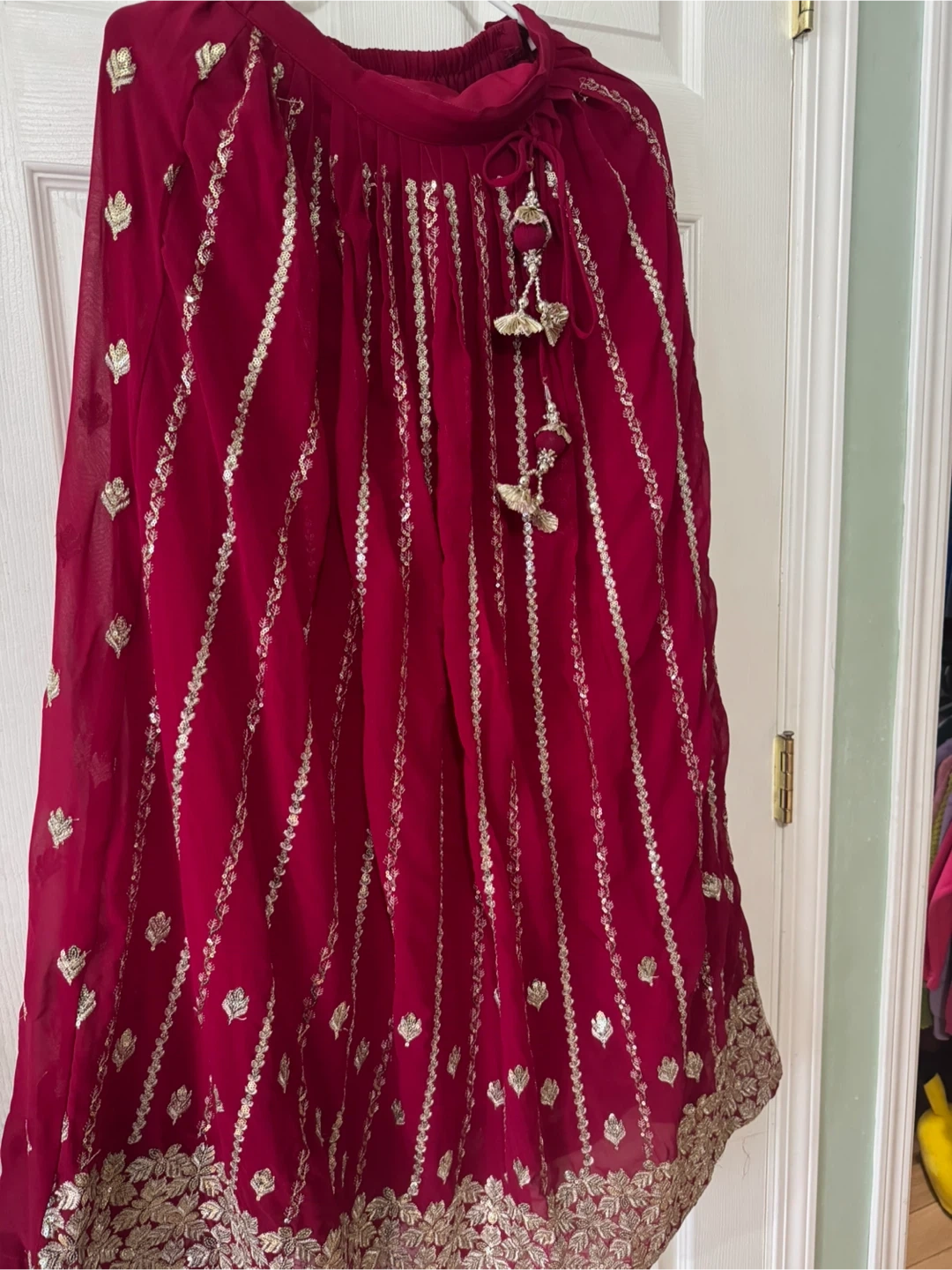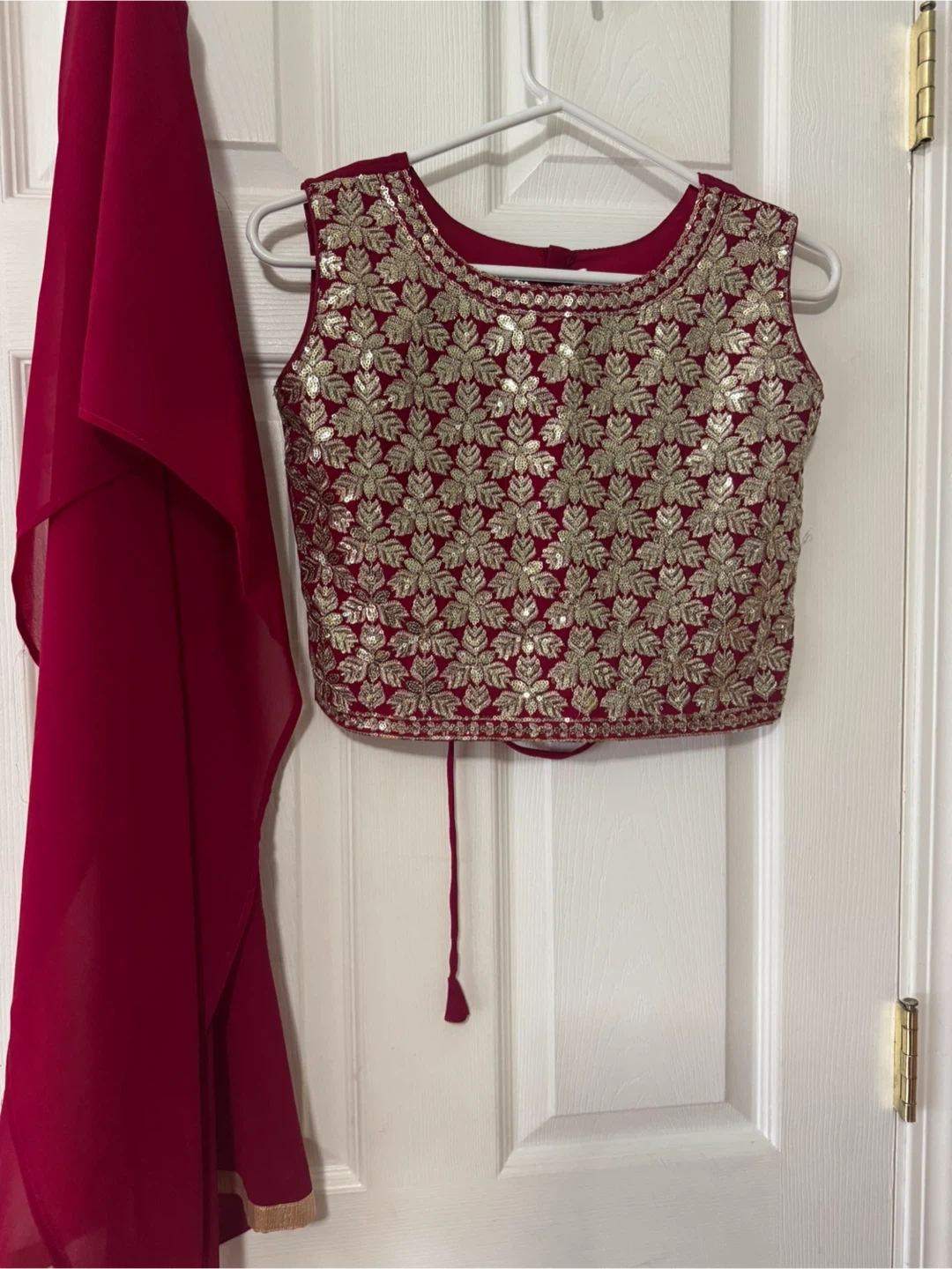 A beautiful red embroidered lehenga choli set with intricate gold detailing.It also comes with a matching dupatta. Perfect for cultural events and celebrations!