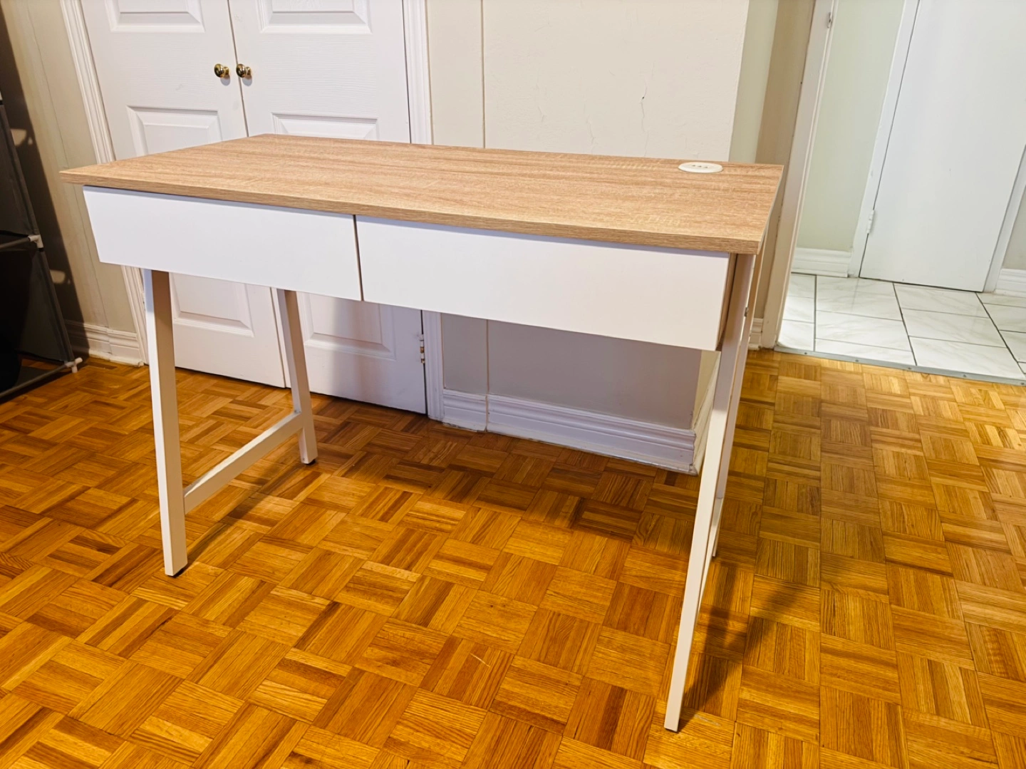 Stylish writing desk. Features two drawers and light wood top. White legs and drawer fronts. Minimalist design. Great for home office or bedroom.USB PORT.