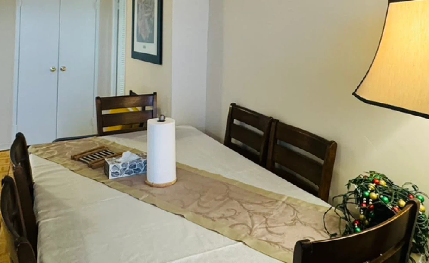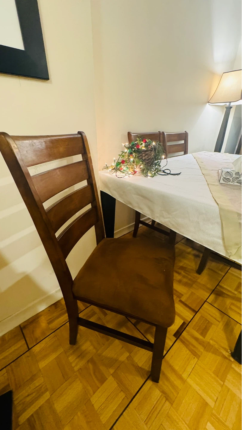 Six dark wood dining chairs with horizontal slats on the backrest. These chairs are sturdy and would fit well in most dining rooms. They're great for family dinners or entertaining guests.