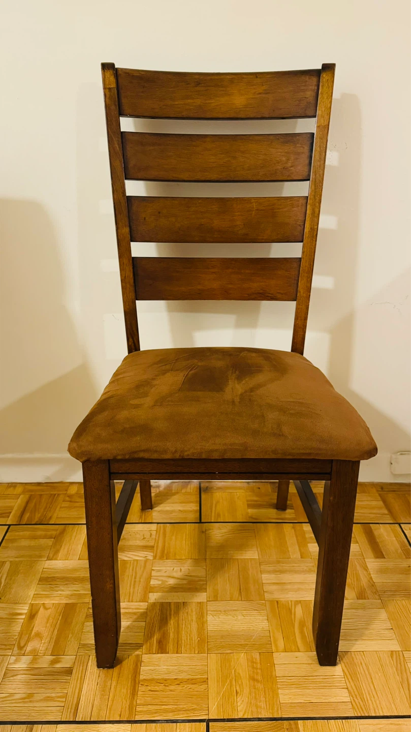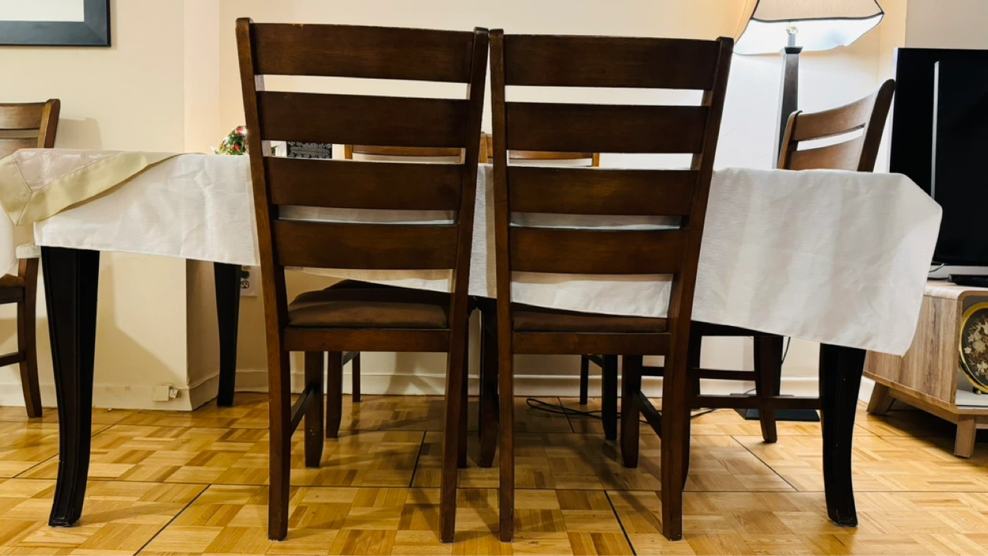 Six dark wood dining chairs with horizontal slats on the backrest. These chairs are sturdy and would fit well in most dining rooms. They're great for family dinners or entertaining guests.