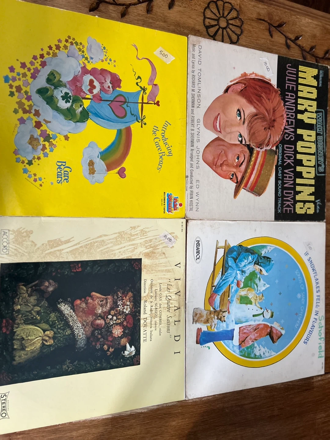 This lot includes four vinyl records. Two are children's oriented: 'Care Bears' and 'Walt Disney's Mary Poppins Original Cast Sound Track'. The other two are classical music: 'Vivaldi' and 'If Snowflakes Fell in Flurries'. Records are in sleeves. Great for collectors!