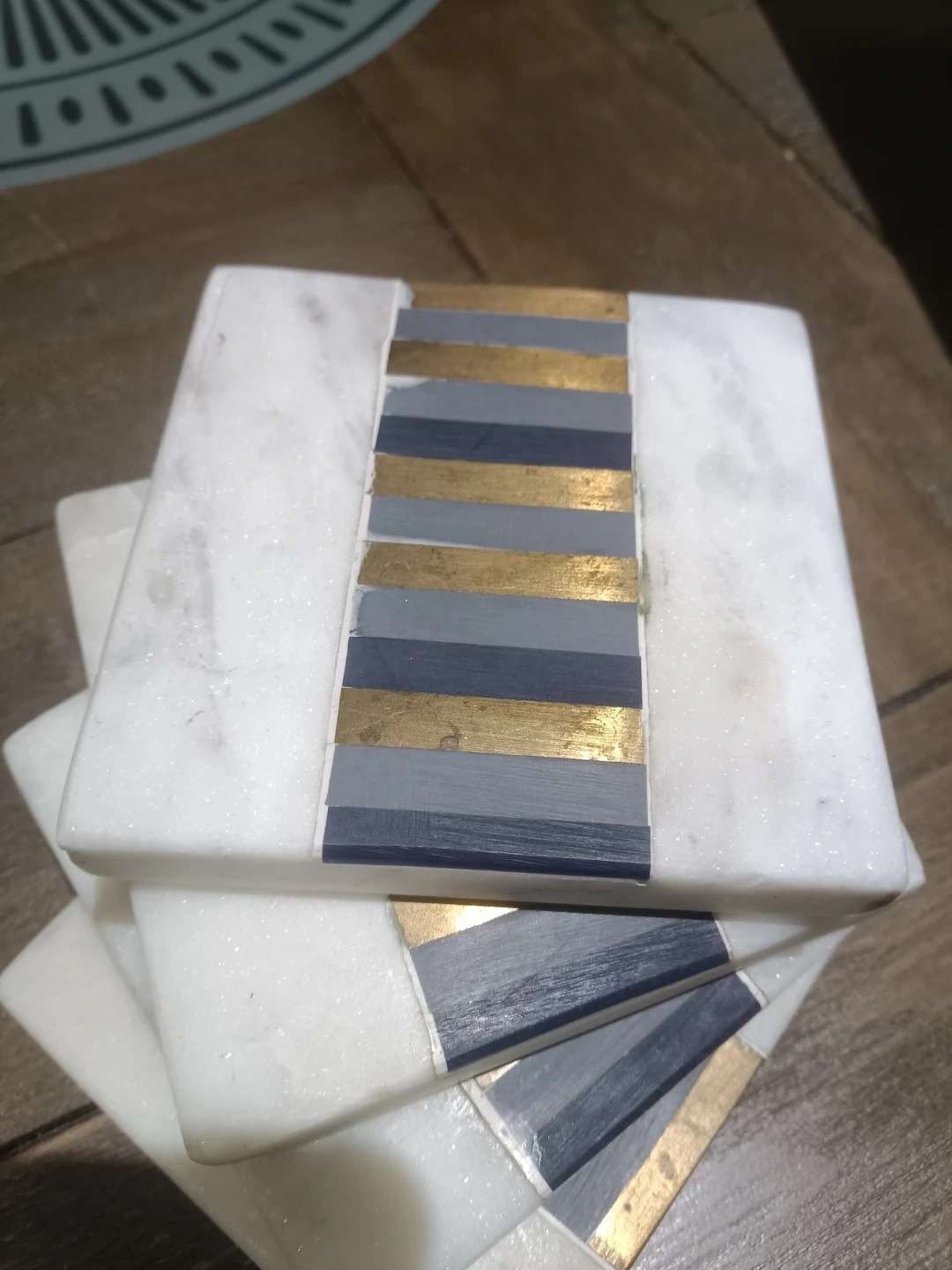 Beautiful these coasters are made of white marble and feature a decorative inlay of grey, dark blue, and gold stripes. They come as a set of four. Great for protecting your surfaces!