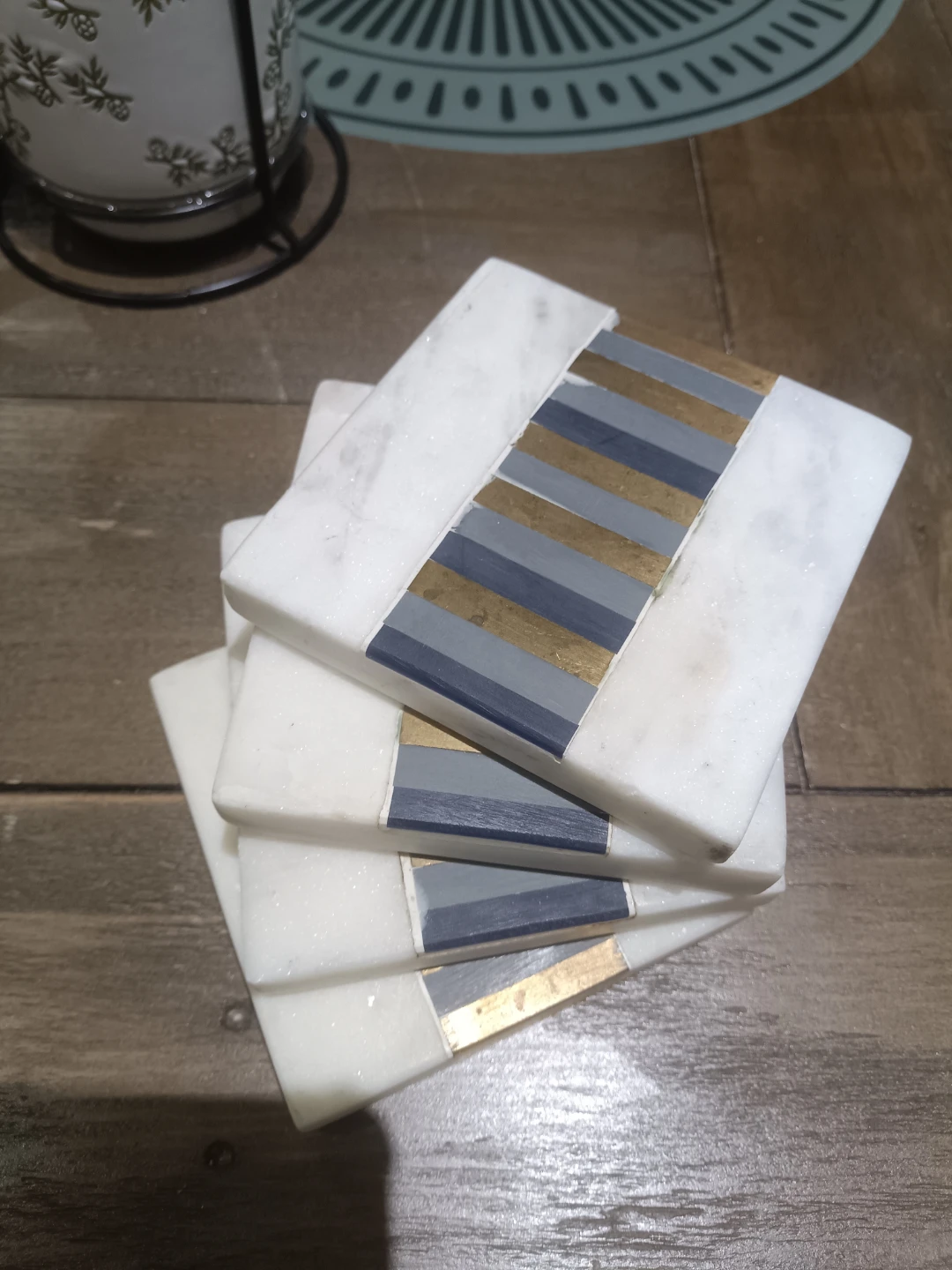 Beautiful these coasters are made of white marble and feature a decorative inlay of grey, dark blue, and gold stripes. They come as a set of four. Great for protecting your surfaces!