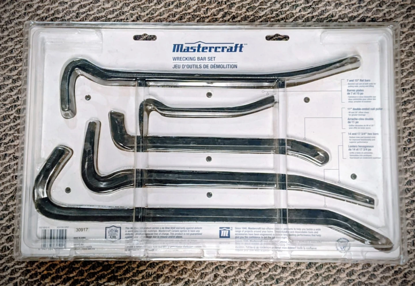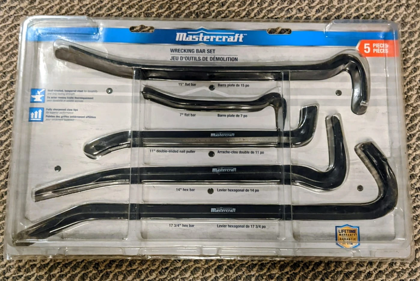 Brand new. Mastercraft 5-piece wrecking bar set. Includes 15" flat bar, 7" flat bar, 11" double-ended nail puller, 14" hex bar, and 17 3/4" hex bar. Heat-treated, chrome-vanadium steel. Features sharply sharpened claw tips.