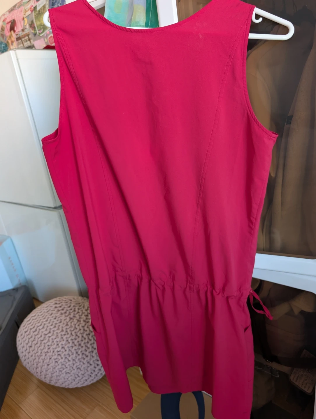 This is an Arc'teryx sleeveless dress in a bright pink colour. It features a drawstring waist for a customizable fit and convenient pockets. Made in Canada.