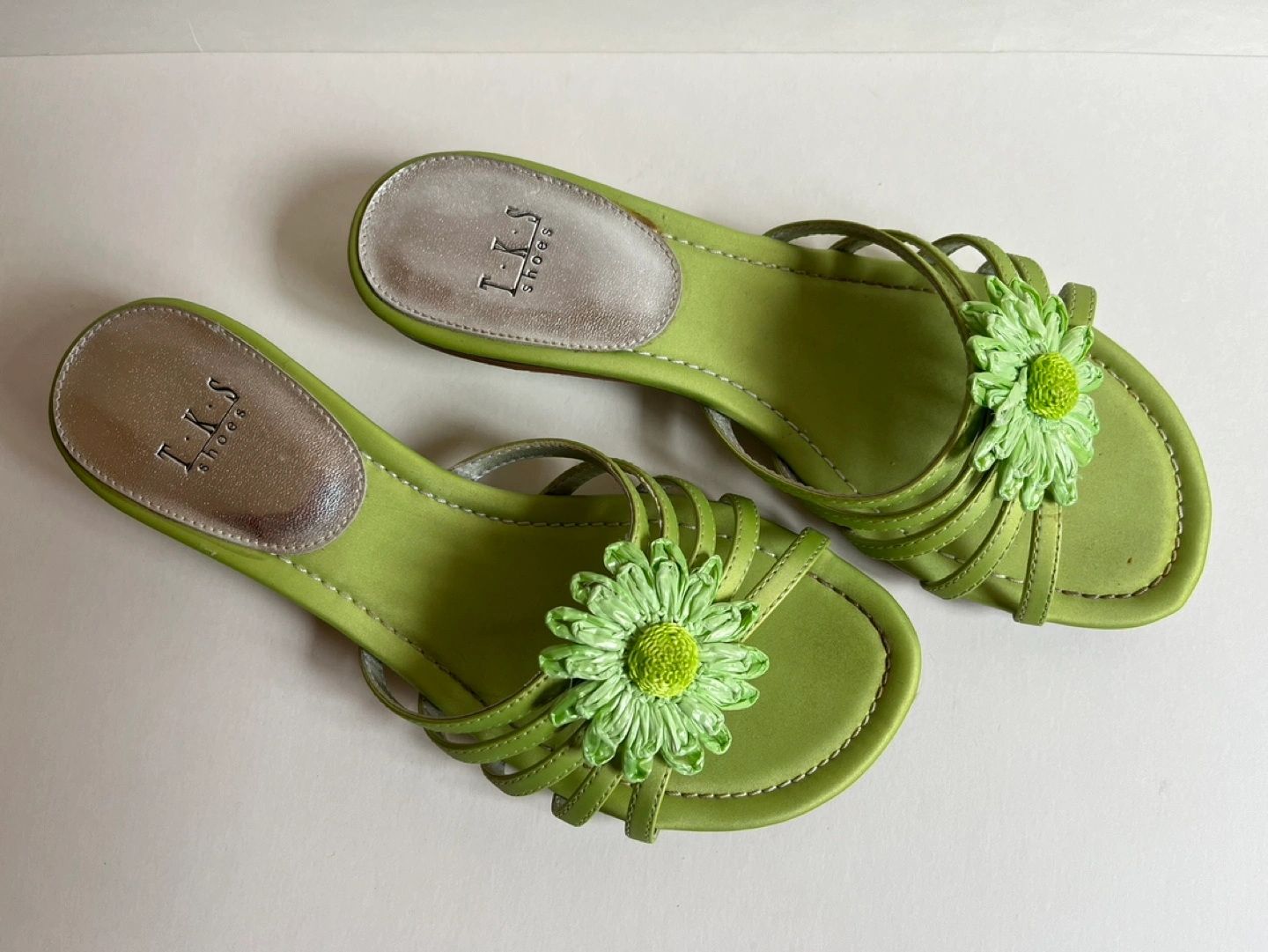 Women's lime green sandals. Low wedge heel. Floral embellishment. Size 5. Very good condition.