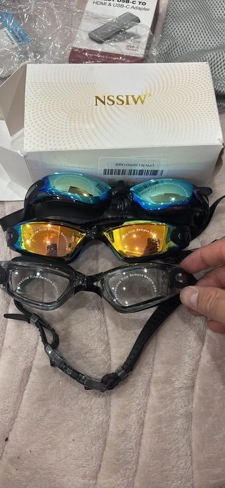 Selling a brand new, never-used set of NSSIW Swim Goggles. This is a complete 3-pack set, perfect for all lighting conditions and swimming environments. The protective films are still on the lenses!