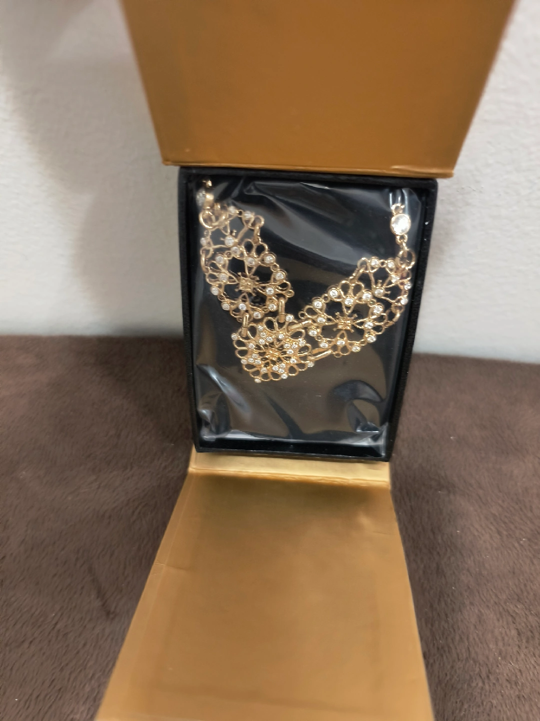 Selling a lovely Avon necklace that comes in its original box. Beautiful Floral Design with t's a beautiful piece, perfect for adding a touch of elegance to any outfit. Gold Tone with Crystals Accents.