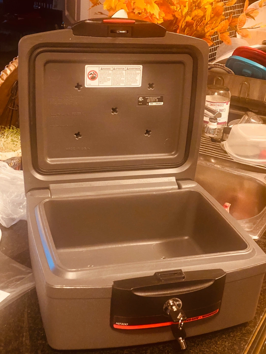This SentrySafe H2300 safe box offers fire and water protection for important documents and valuables. It's made in the U.S.A. and includes a key lock for security. This safe is ideal for protecting critical items from household disasters.