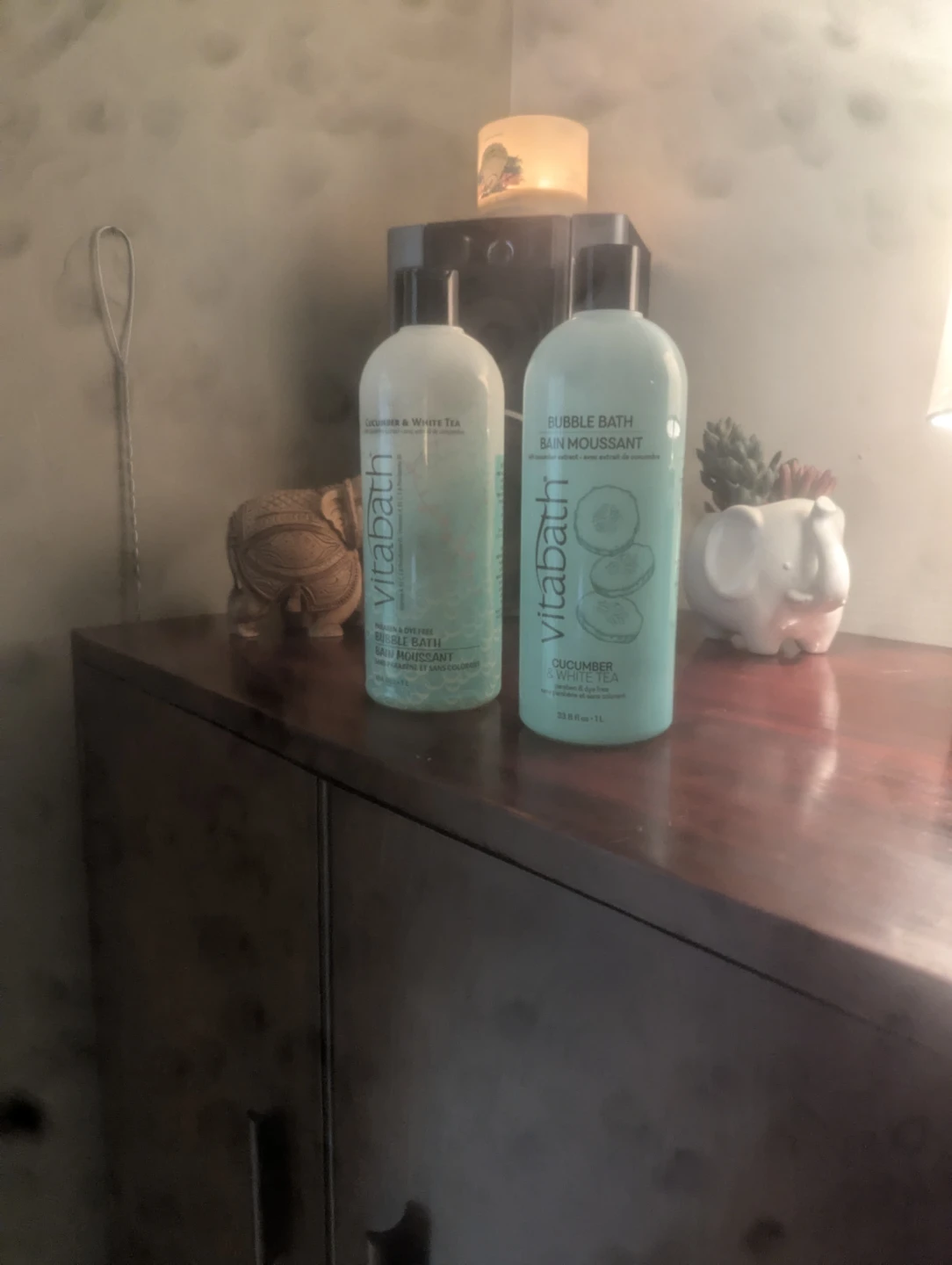 Two bottles of Vitabath bubble bath in Cucumber & White Tea scent. Paraben & dye-free formula. Each bottle contains 1L (33.8 fl oz).