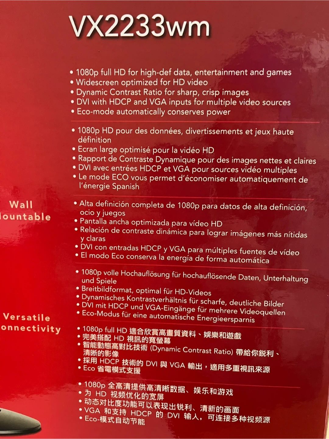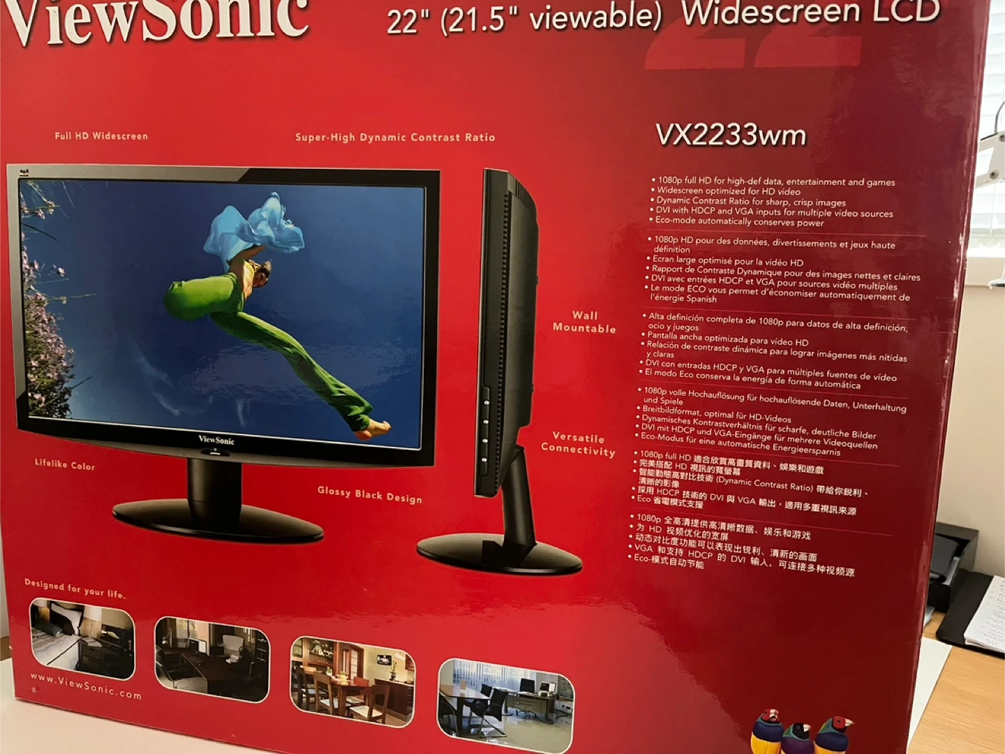 ViewSonic 22-inch Widescreen LCD Monitor, model VX2233wm. It's a 21.5” full HD 1080p display with Dynamic Contrast Ratio. The monitor features DVI (HDCP) and VGA inputs for multiple video sources. Wall mountable.