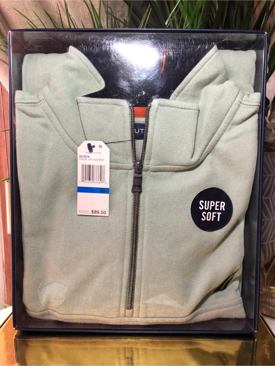 This is a brand new with tags Nautica zip jacket in size XL! The jacket is a beautiful frost color and is super soft. It comes in its original box and the price tag shows it originally retailed for $89.50