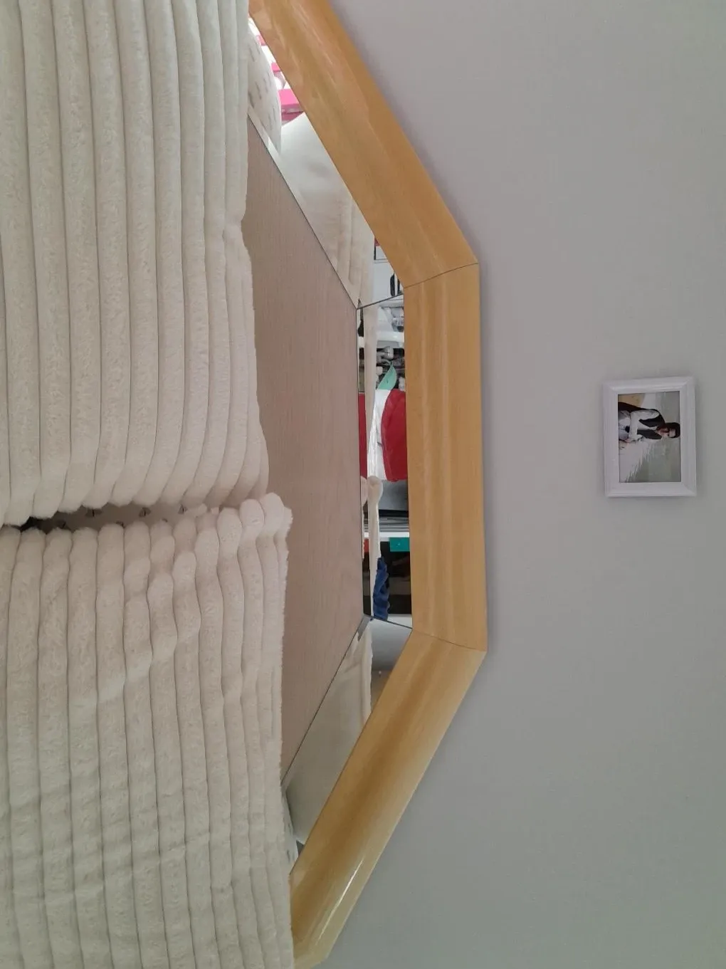 Selling a wall mirror with a light wood frame. It's in great condition and would look lovely in any room! The frame has a unique geometric shape.