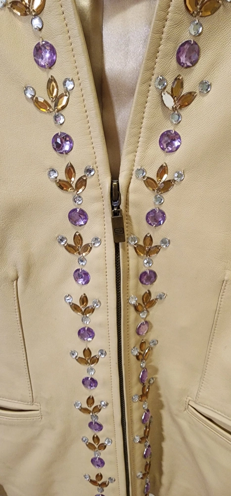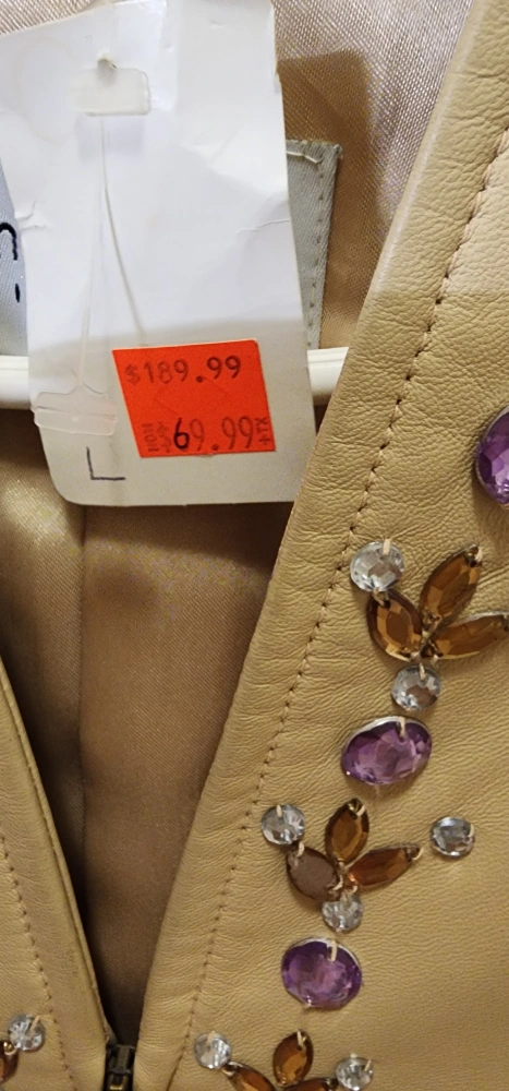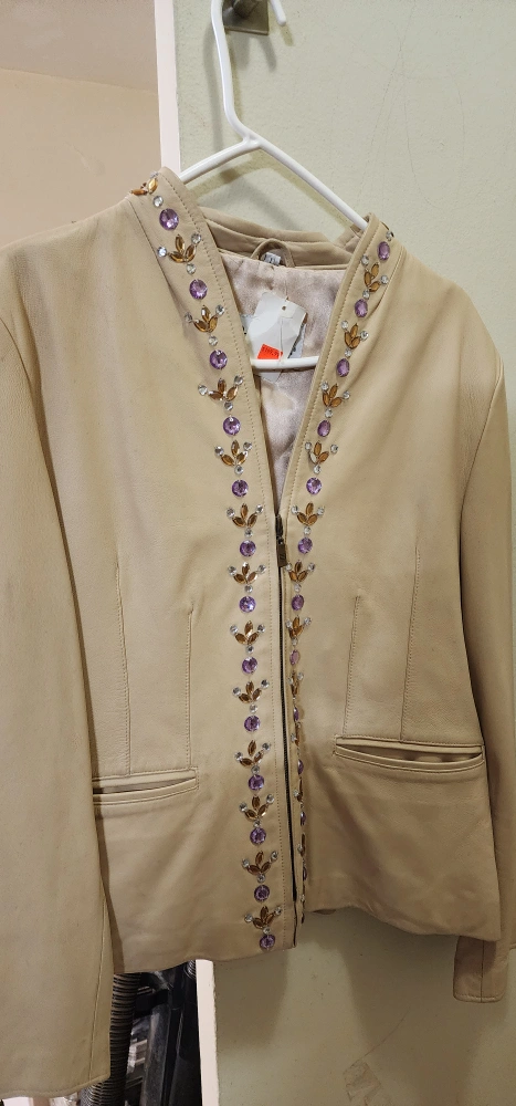 Tan leather jacket with rhinestones. Front zipper closure. Two front pockets.never worn .