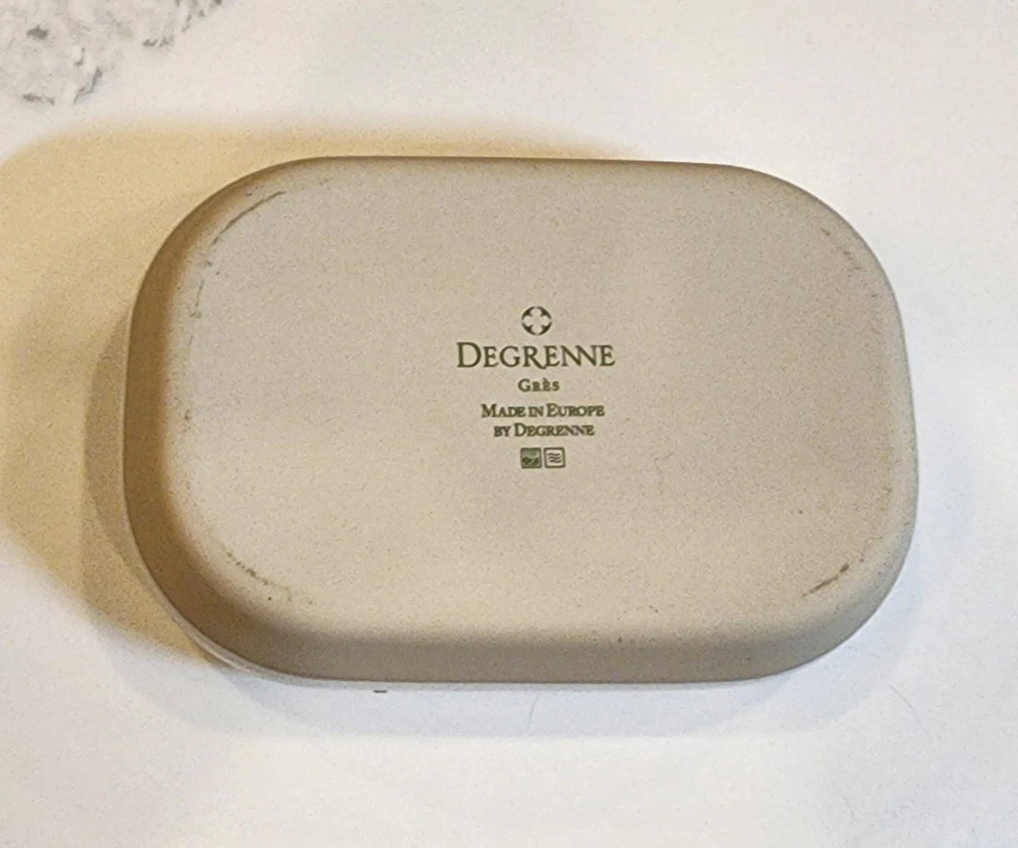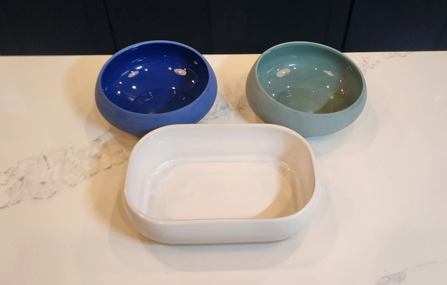 Set of three ceramic dishes by Degrenne, made in Europe. Includes one white rectangular dish and two round serving bowls in blue and green. Perfect for serving snacks or sides!