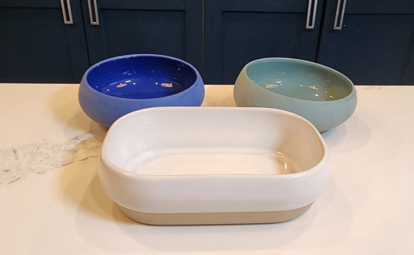 Set of three ceramic dishes by Degrenne, made in Europe. Includes one white rectangular dish and two round serving bowls in blue and green. Perfect for serving snacks or sides!