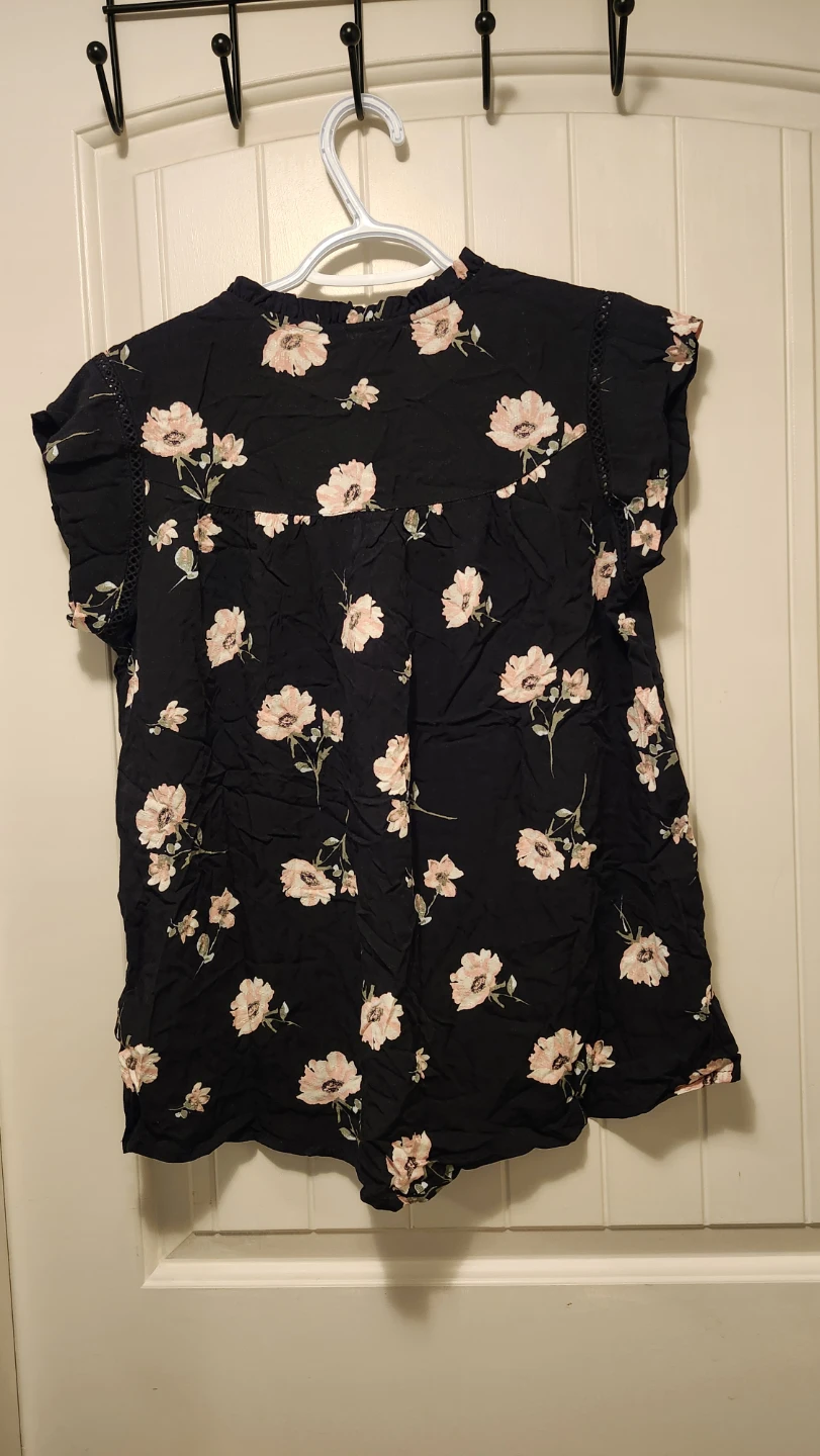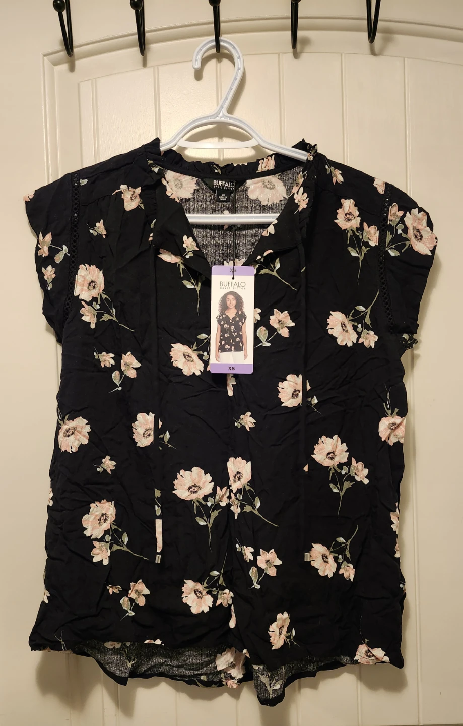 Buffalo David Bitton women's short sleeve blouse with a floral print. It's size XS. This top has lace detail on the sleeves and neckline