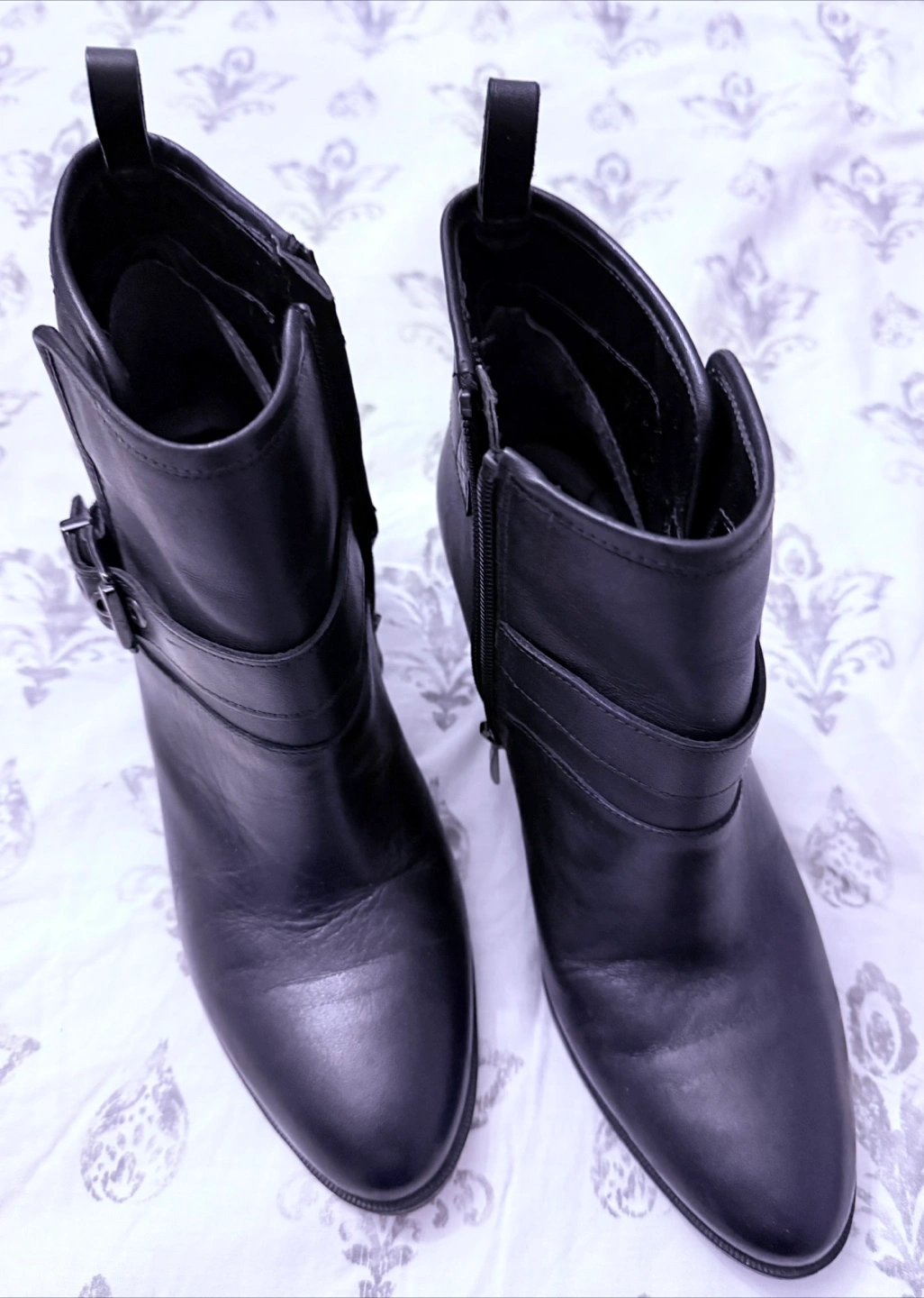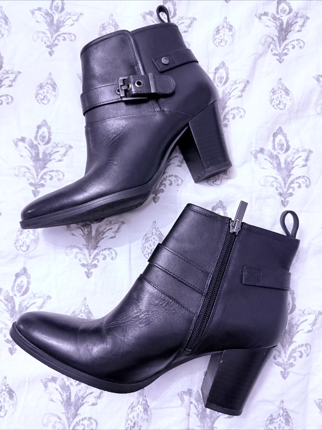 These are a pair of Franco Sarto black leather ankle boots. They feature a stylish design with a buckle and zipper. Perfect for adding a touch of elegance to any outfit!