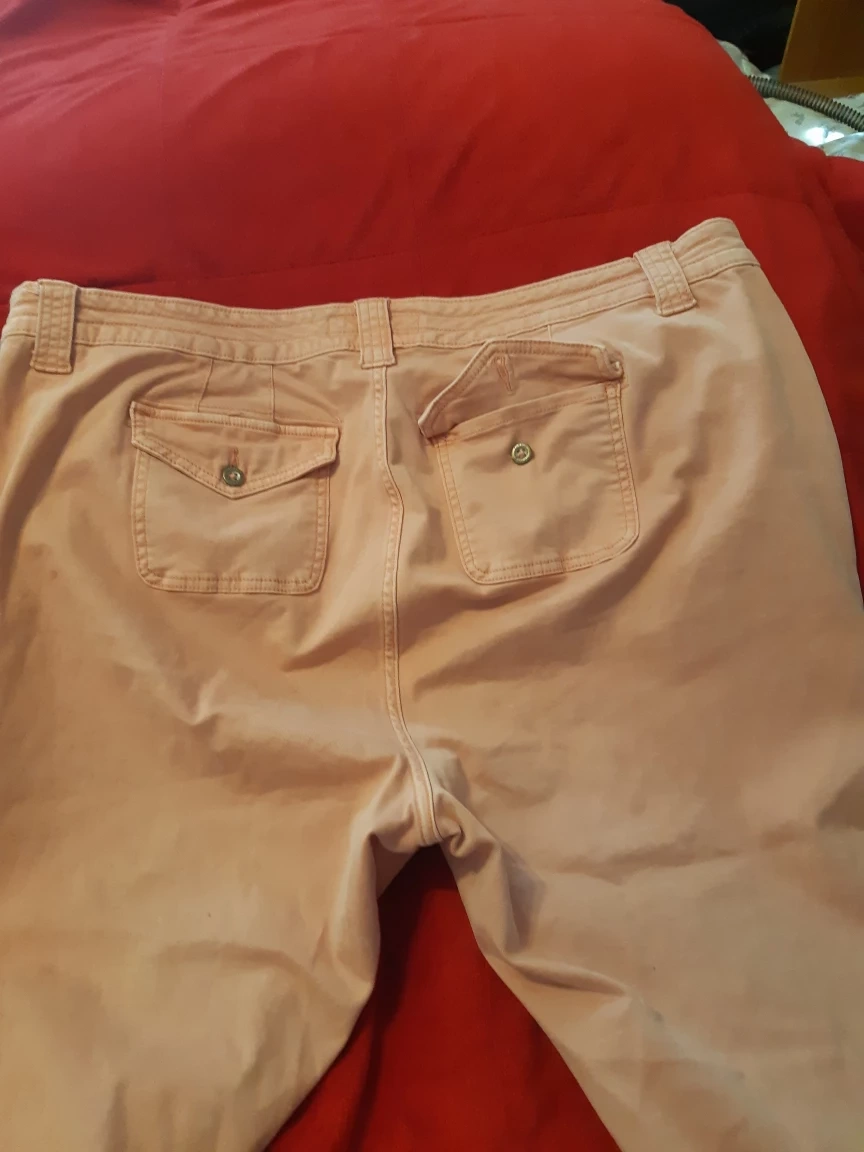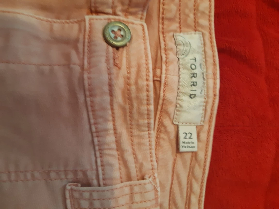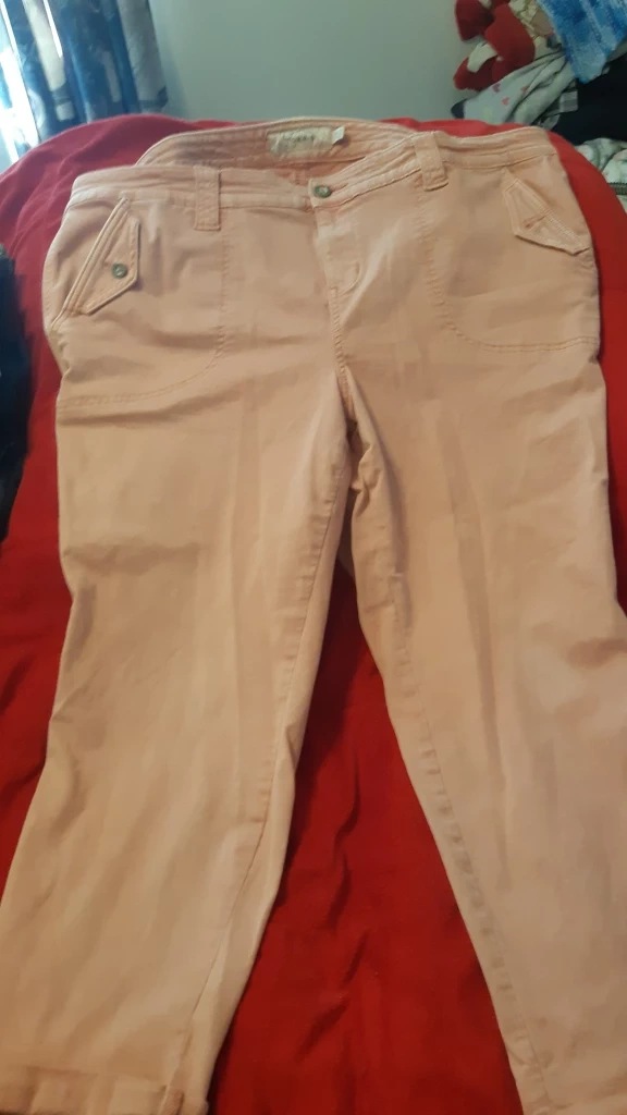 Selling a pair of Torrid crop pants in a lovely pink colour! They are a size 22 and feature a unique pocket design. Perfect for a casual and comfortable look!