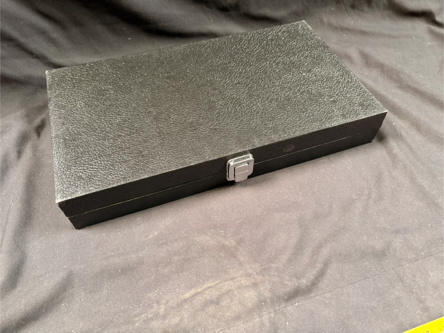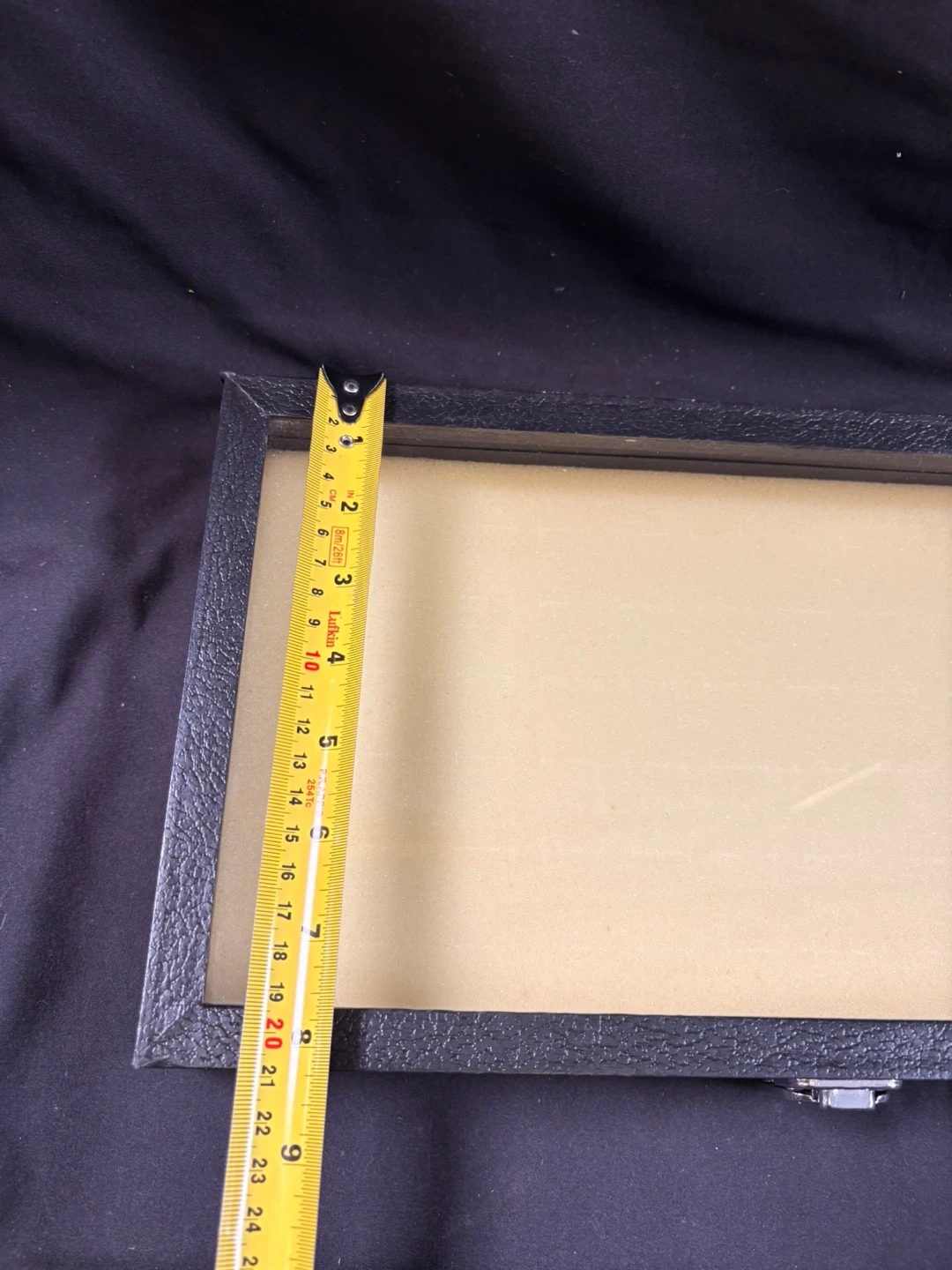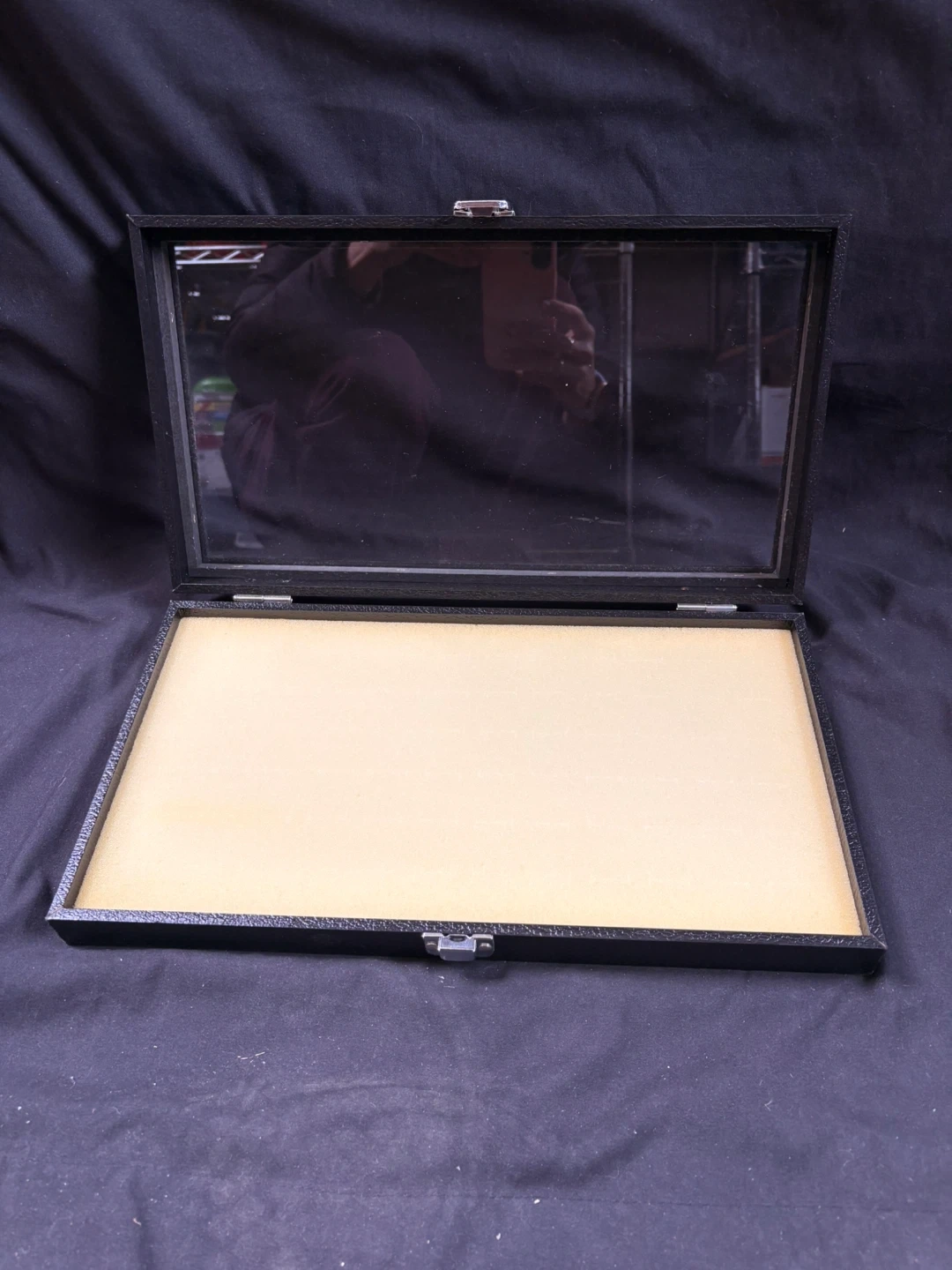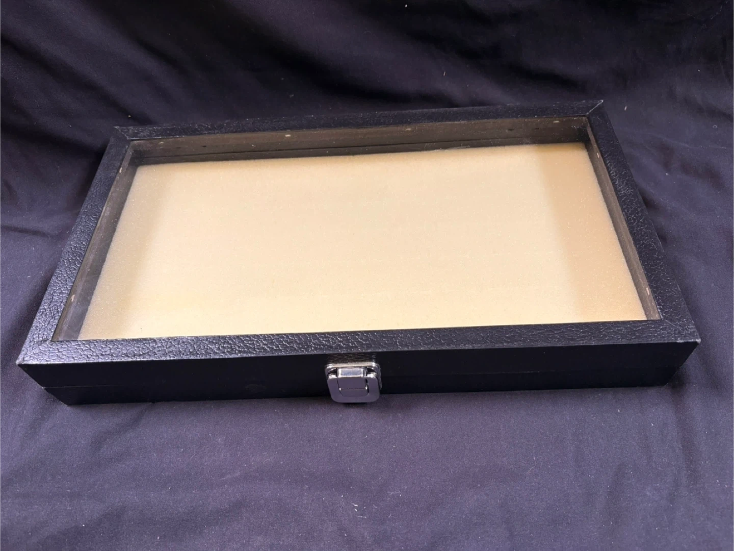 Black display case with a clear glass lid. It's perfect for showcasing collectibles or keepsakes. The interior is lined with a soft beige material and it has a secure metal clasp closure.