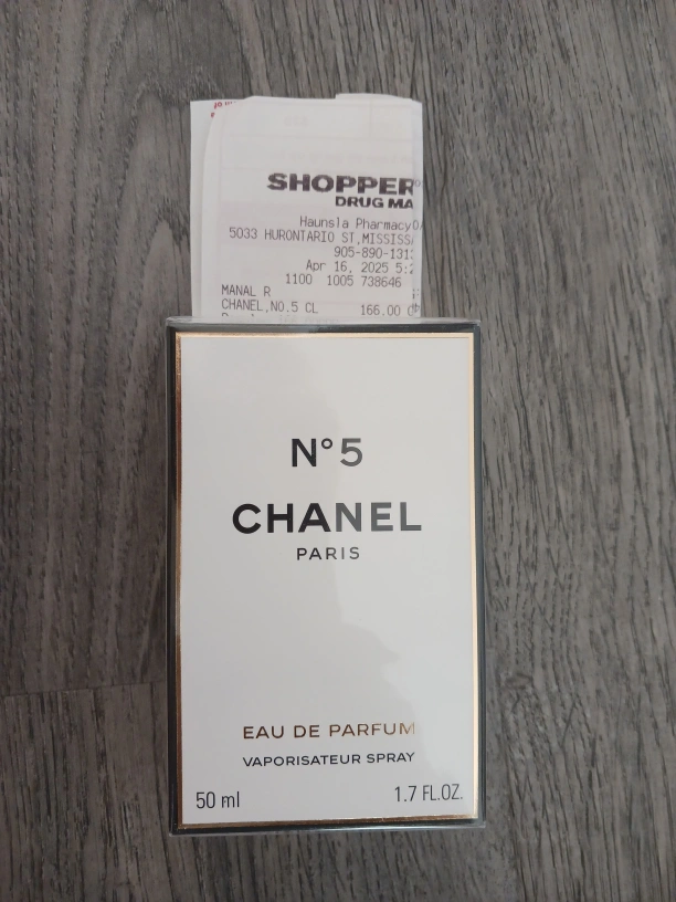 Selling a bottle of Chanel No. 5 Eau de PARFUM. It's a 50ml bottle and comes in its original packaging. The receipt shows the original price was $166. A timeless classic!