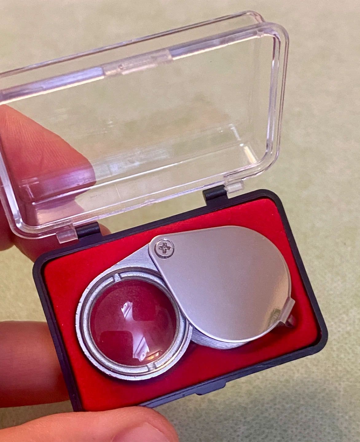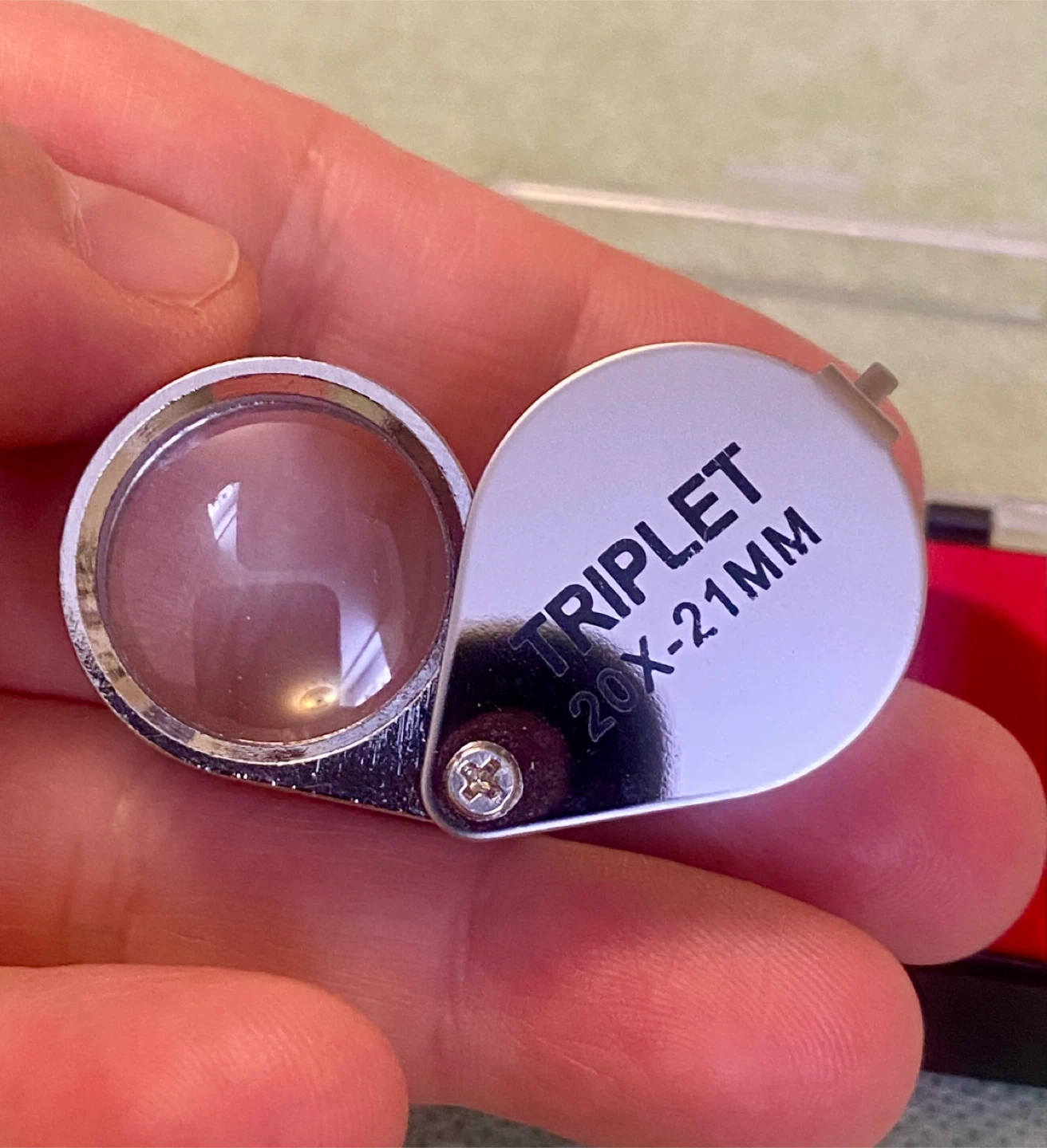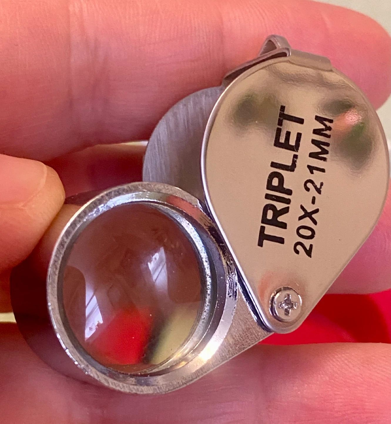 This is a triplet magnifier with 20x magnification and a 21mm lens. It comes with a protective case. Handy for close-up work or inspection!