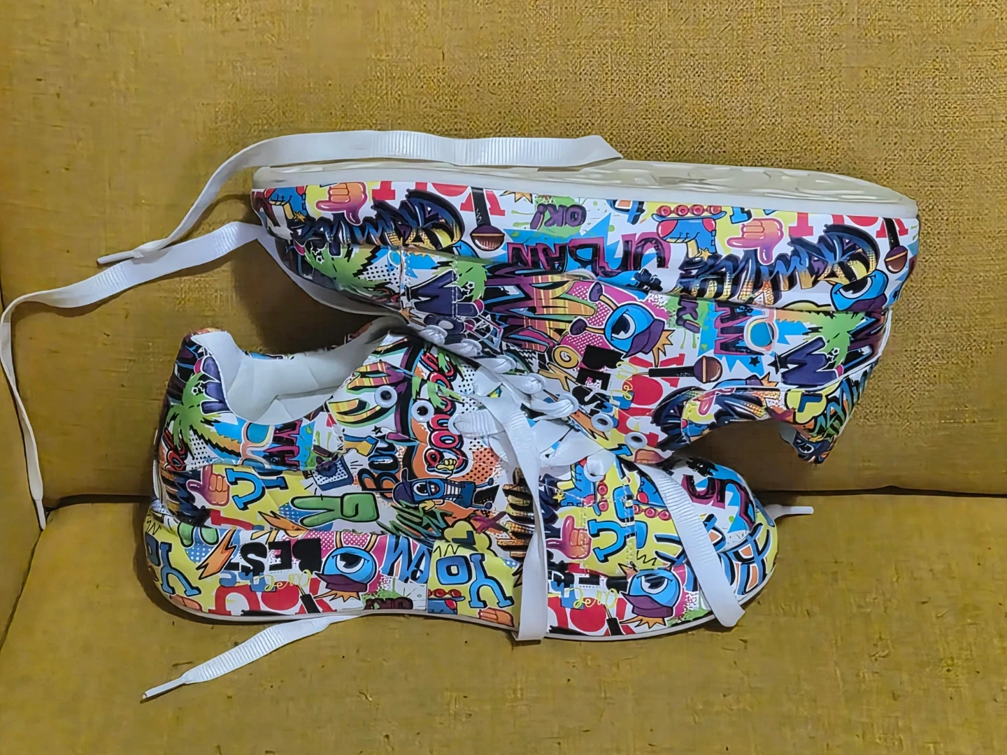 These Womens sneakers feature a vibrant graffiti print design all over. They have white laces and clean white soles. Size womens 8 to 8.5 and are Brand new