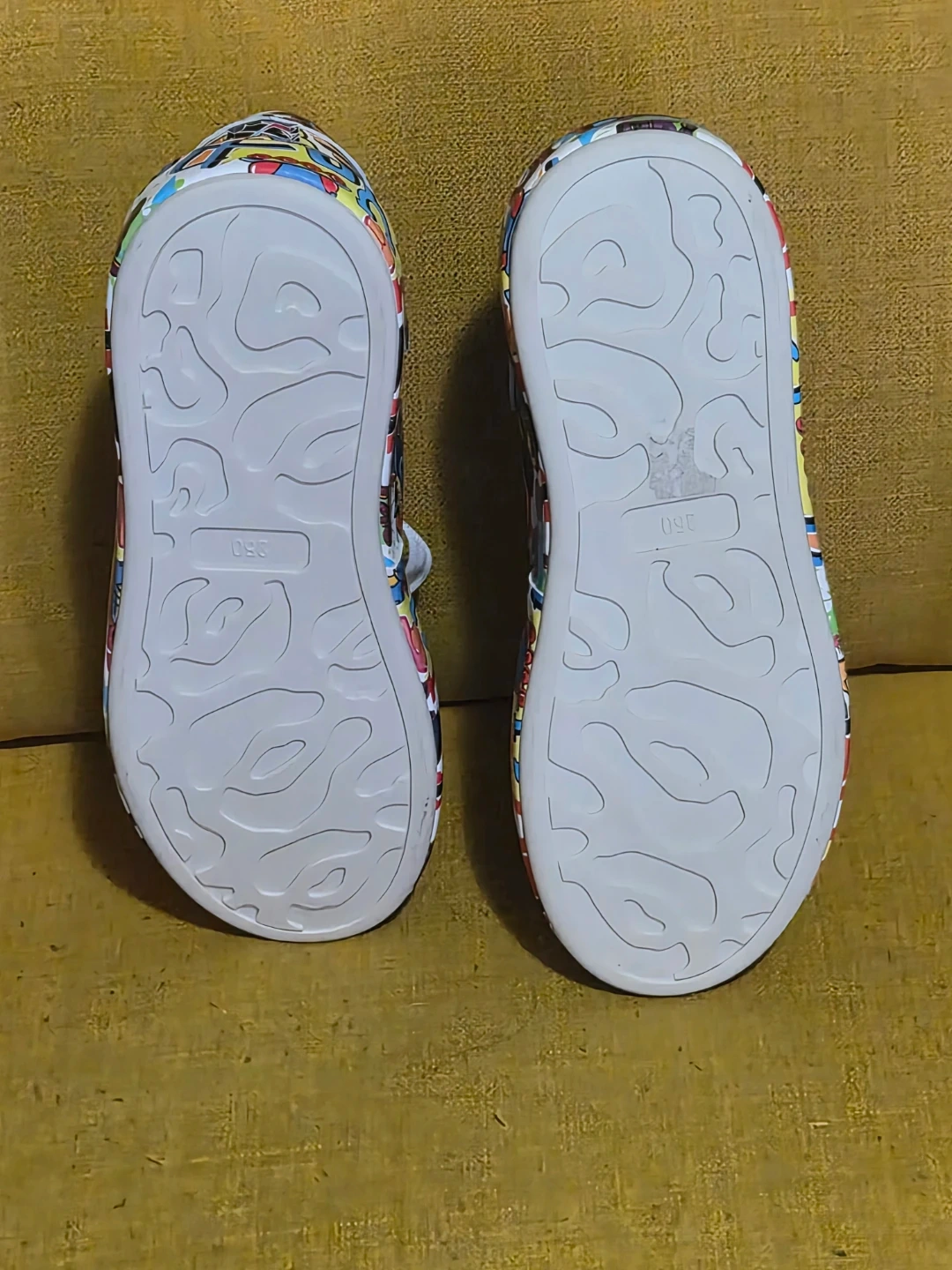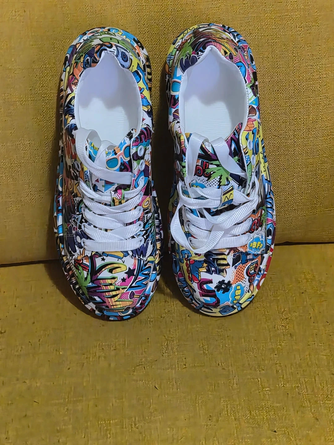 These Womens sneakers feature a vibrant graffiti print design all over. They have white laces and clean white soles. Size womens 8 to 8.5 and are Brand new