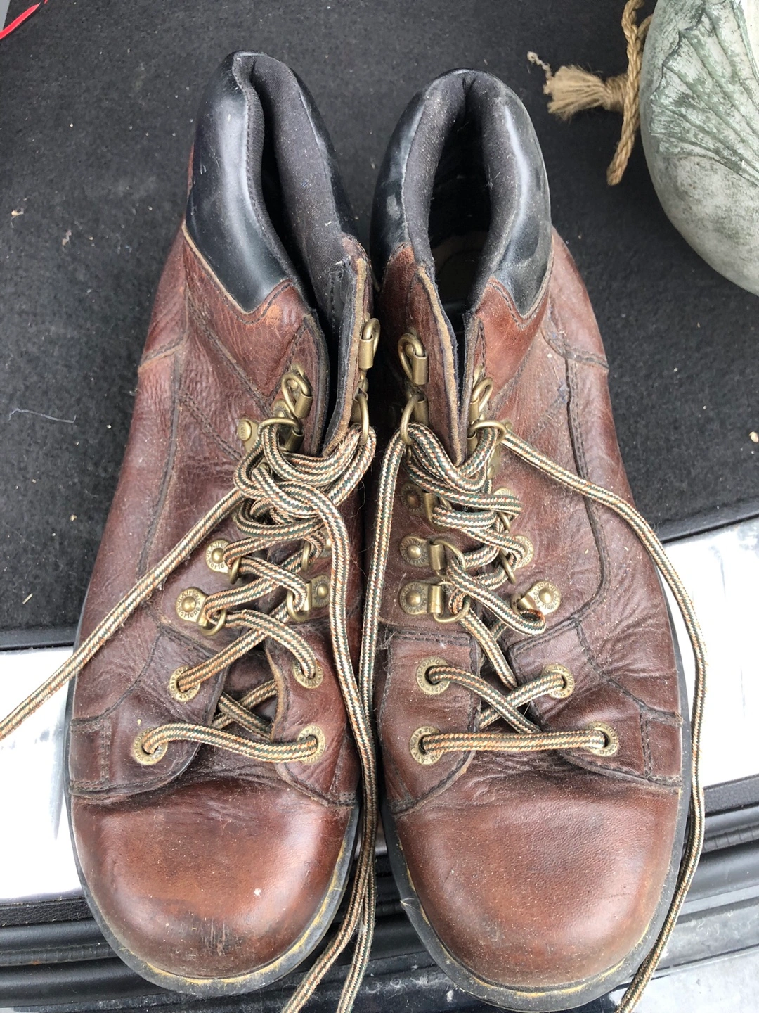 Brown leather lace-up boots with a yellow stitching detail on the laces. The boots have a black leather trim and black laces. There are Dr. Martens logos on the back of each boot. The boots have a yellow stitched air-cushioned sole.