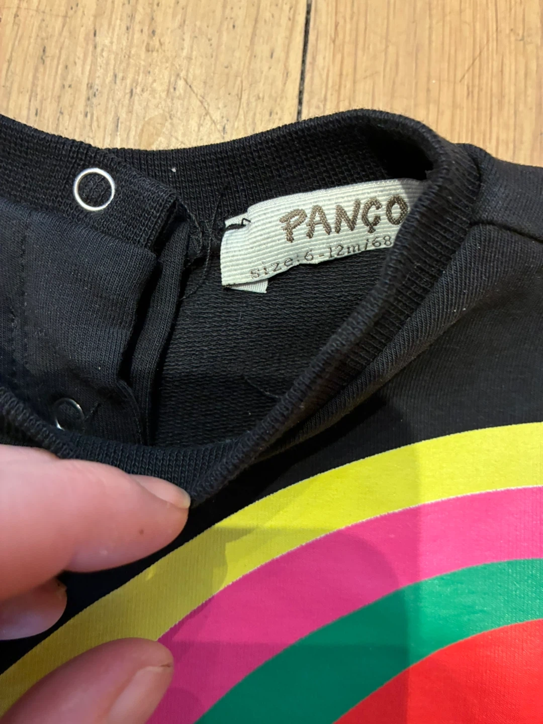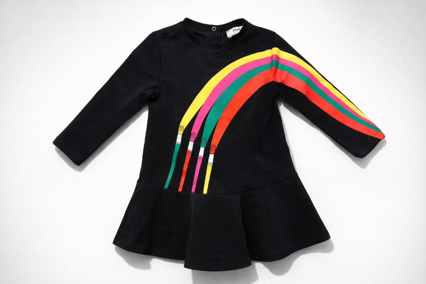 Adorable paintbrush dress for your budding little artist. It's a long-sleeved dress with a peplum hem. Size is 6-12 months.