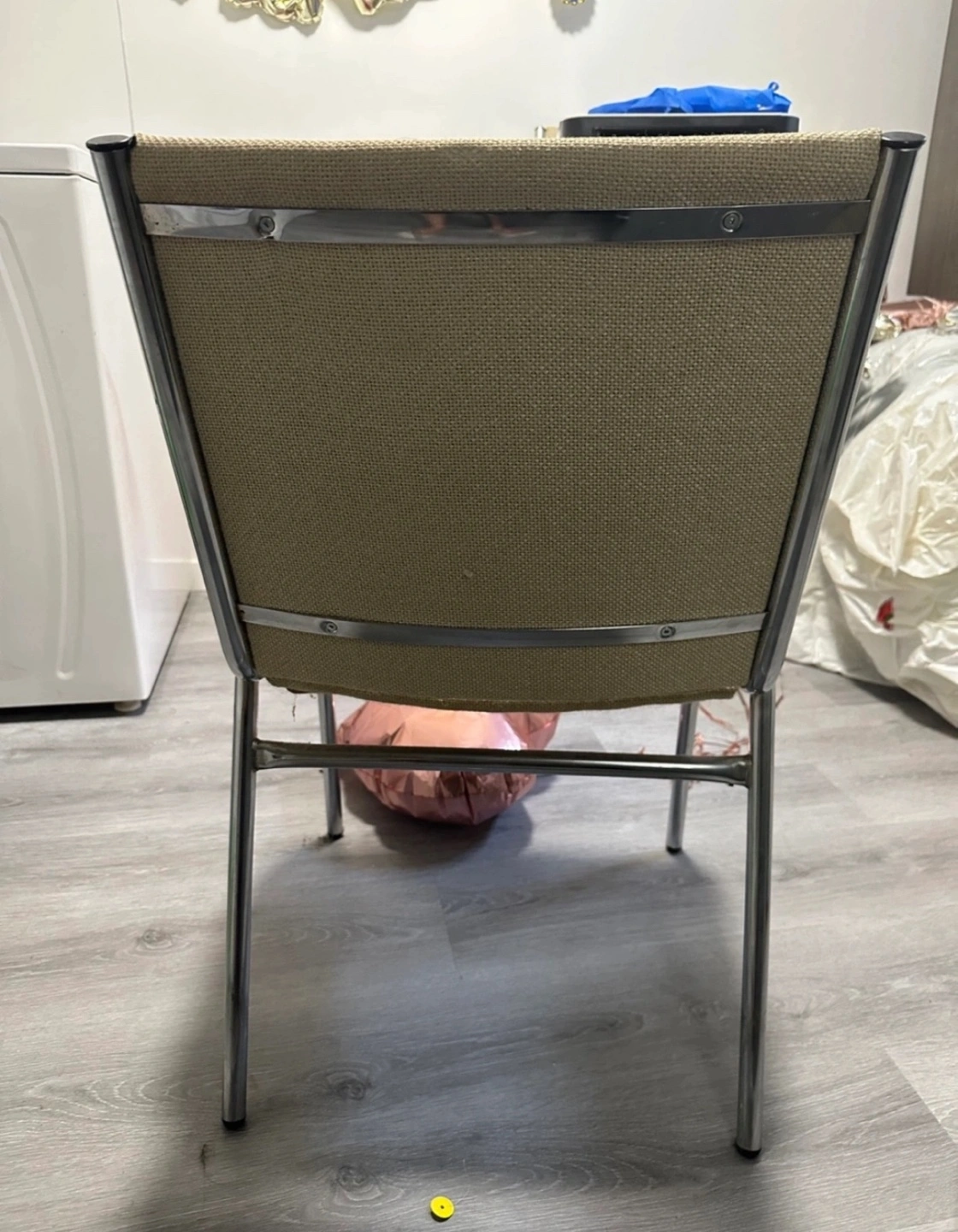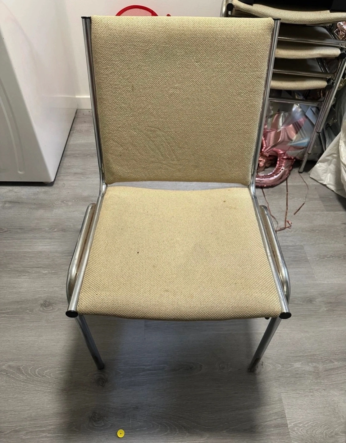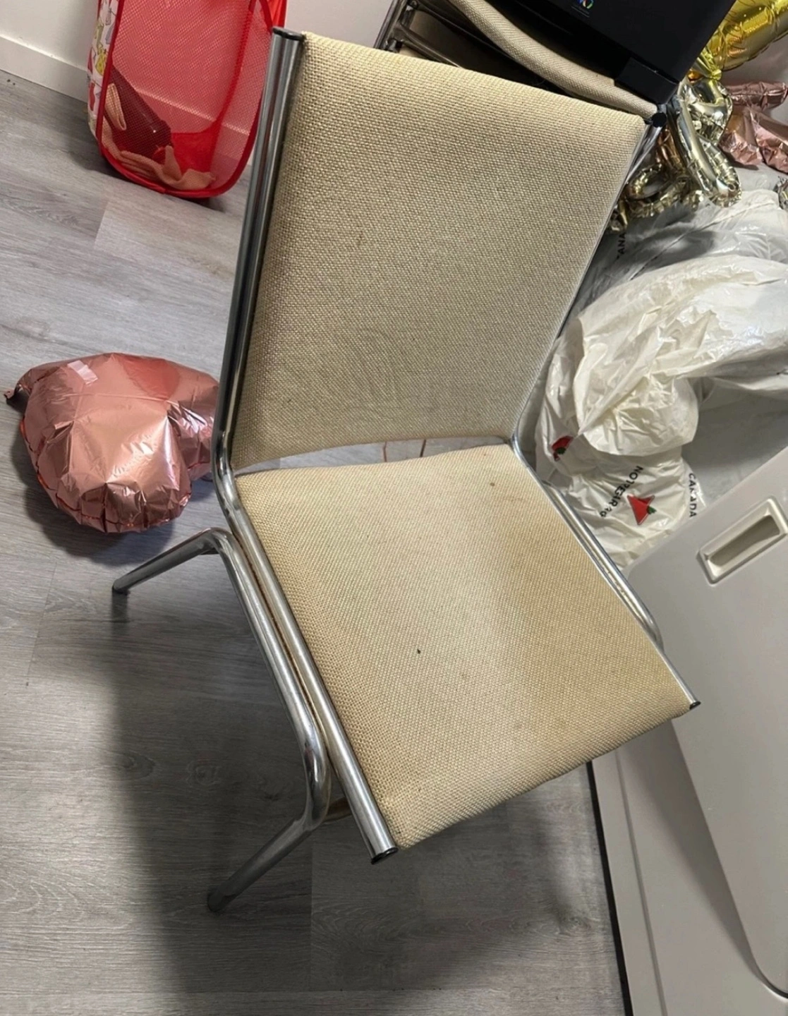 Chrome and beige fabric dining chair. Slight wear on the fabric.