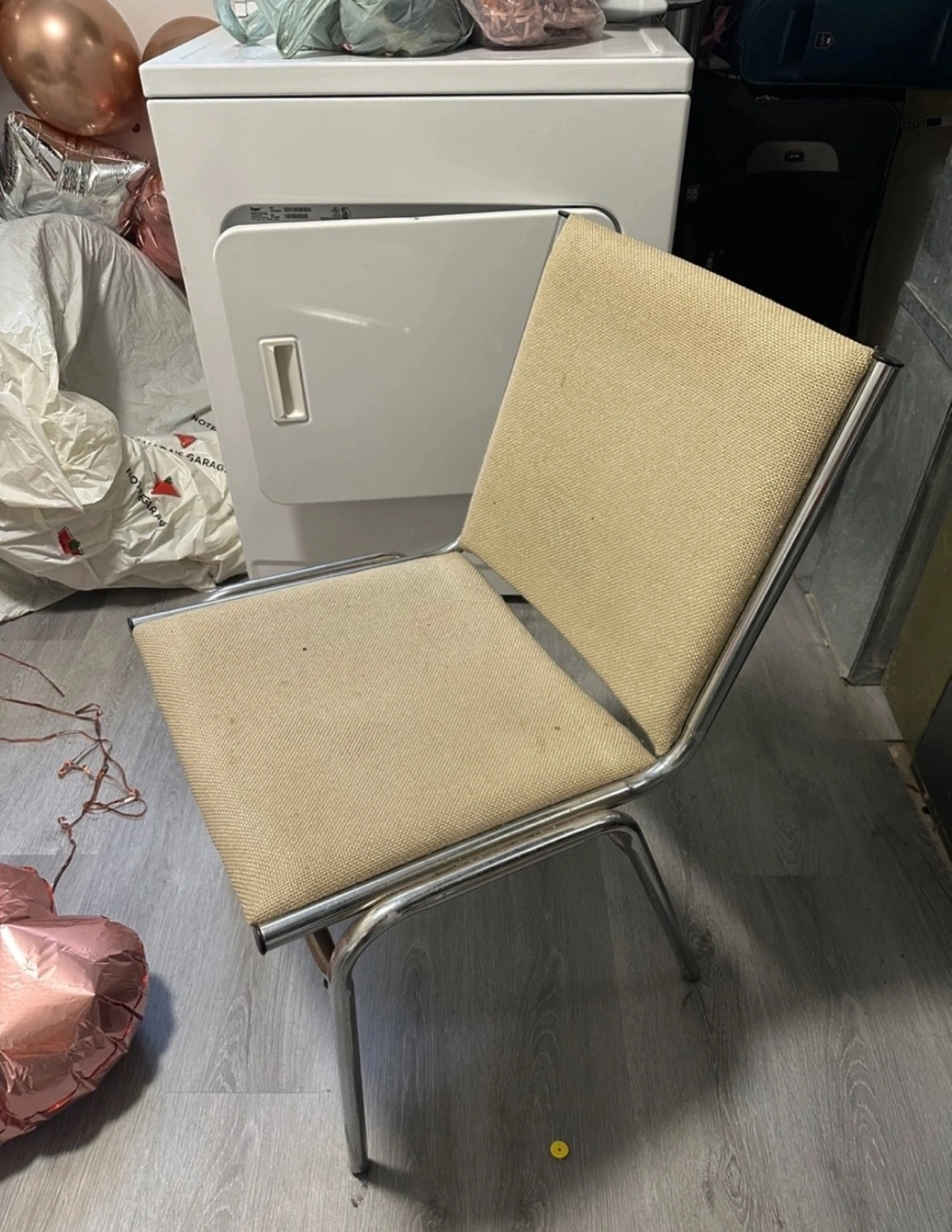 Chrome and beige fabric dining chair. Slight wear on the fabric.