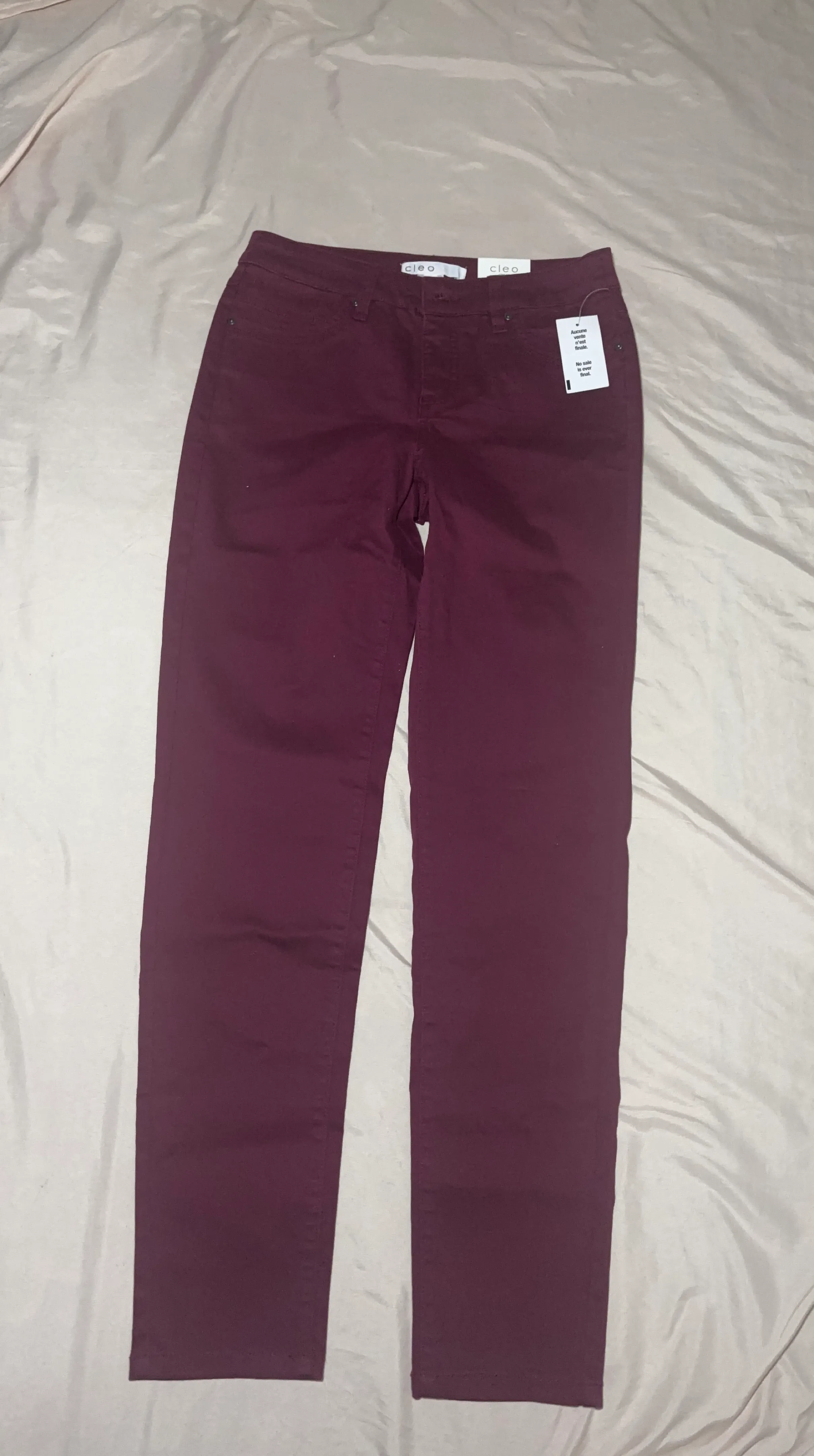 These are brand new Cleo women's pants in a rich burgundy colour. They're a size 10 and still have the original tags attached. Made with a comfortable blend of cotton and spandex for a great fit.