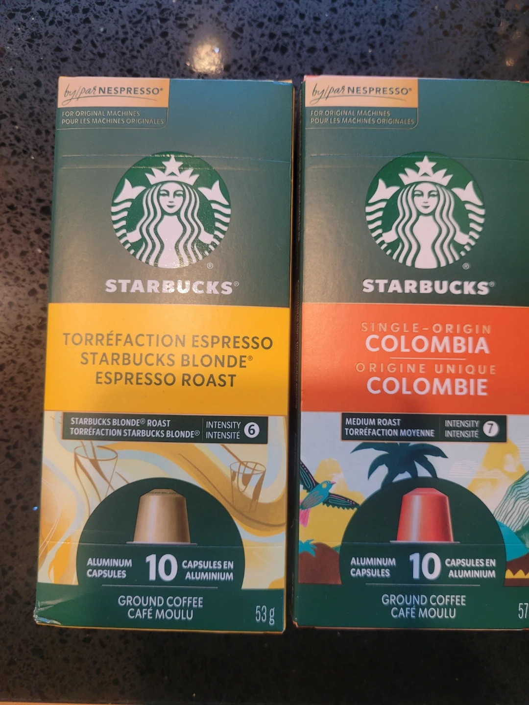 Selling a variety of Nespresso Starbucks pods, including Torréfaction Espresso Starbucks Blonde Espresso Roast and Single-Origin Colombia. Also included is a DeLonghi Nespresso machine. Perfect for your morning coffee!