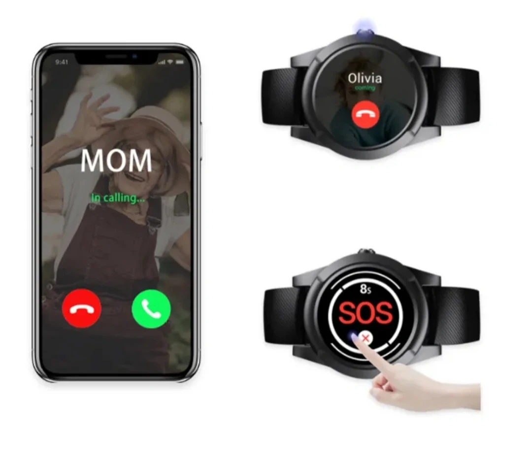 This smart watch displays incoming calls and an SOS function. It's ideal for quick communication and safety alerts. It has a black band and a round face.