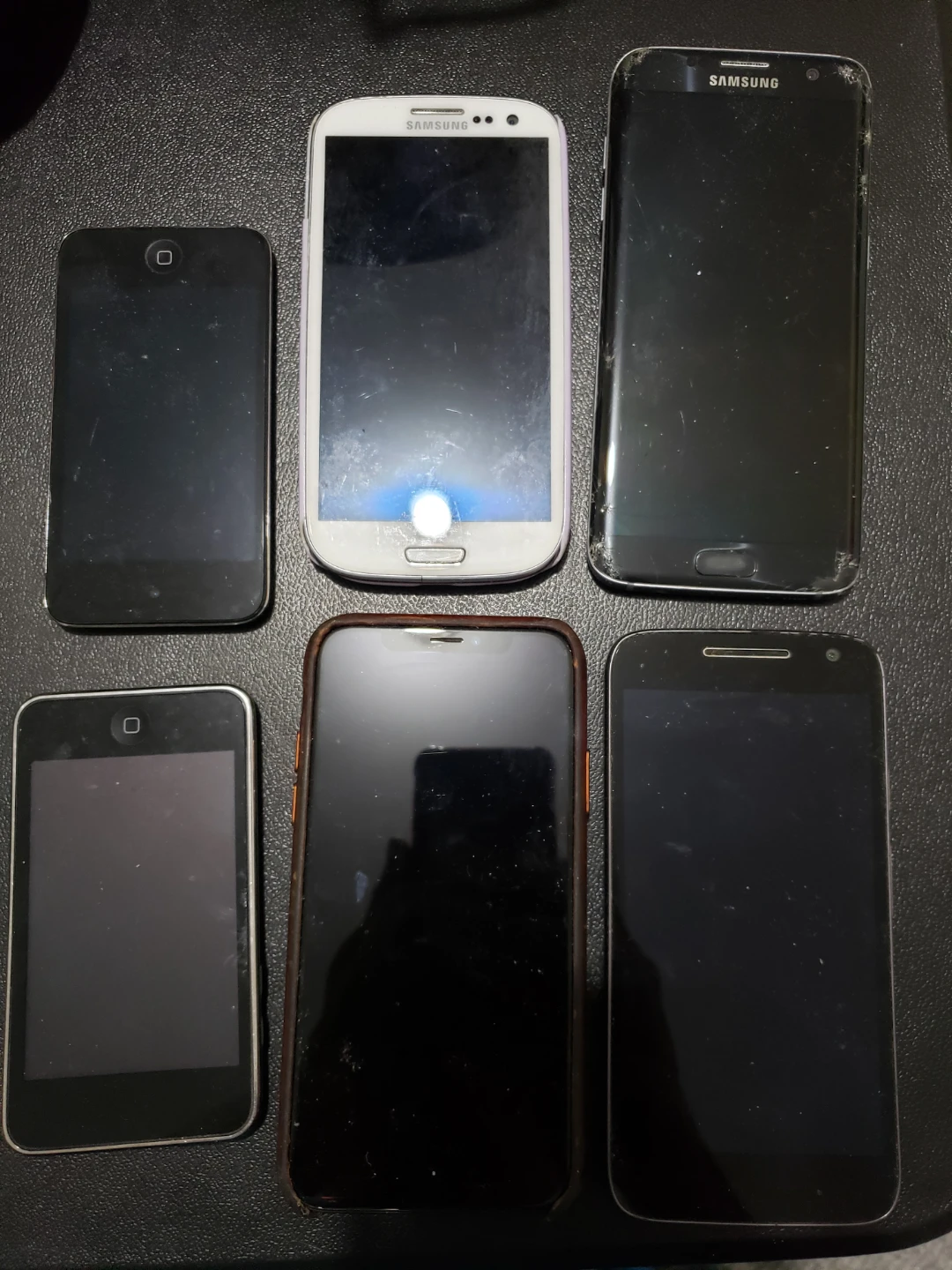 This lot includes six used electronic devices. You'll find two iPods, two Samsung Galaxy phones, one iPhone, and one Motorola phone. All devices appear to be in used condition.