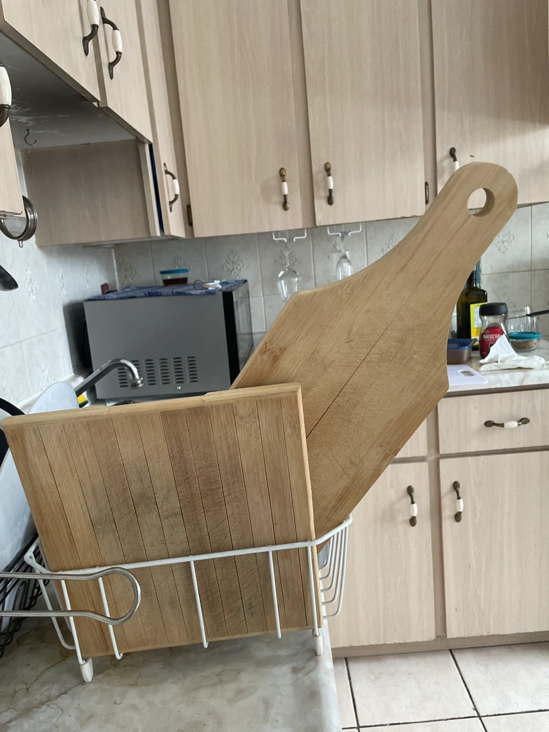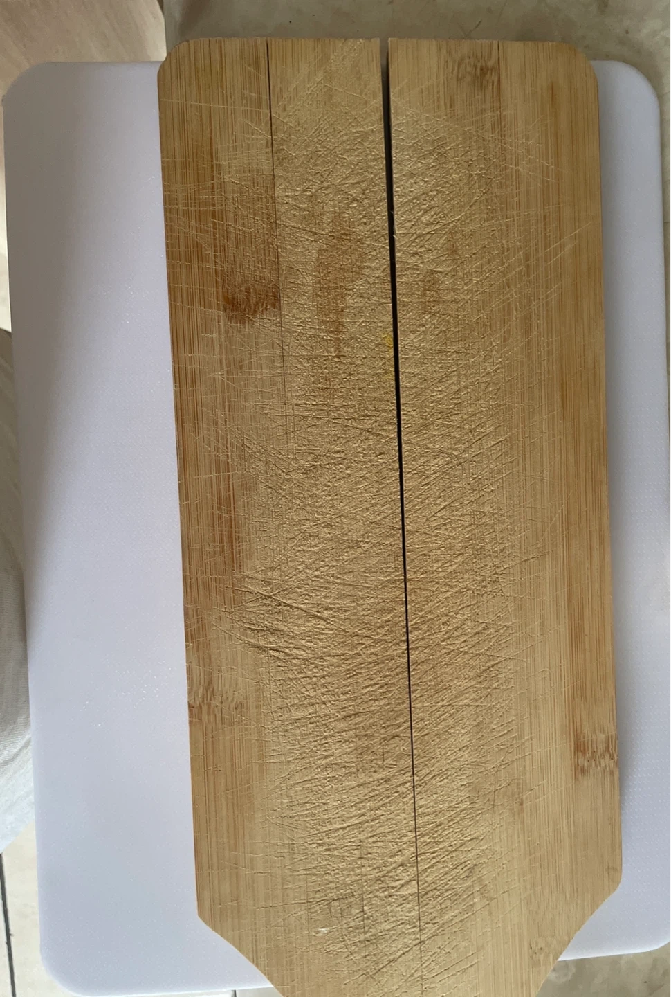 This set includes two bamboo cutting boards. They show signs of use with some knife marks.