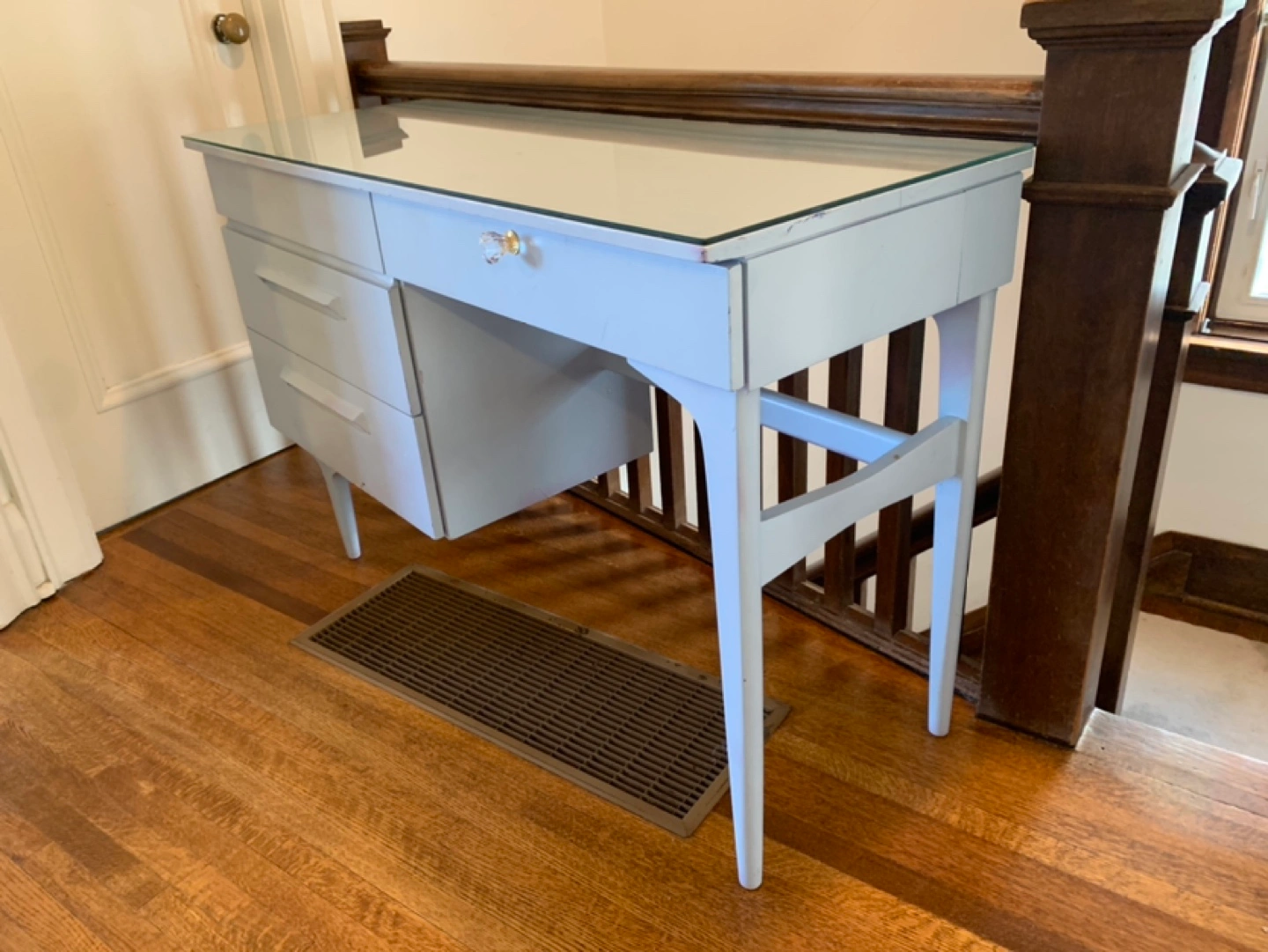 Beautifully redone desk, perfect for a child of any age. Baby blue finish with delicate knob for elegant design with a glass top. 49in Wide x 18in Deep