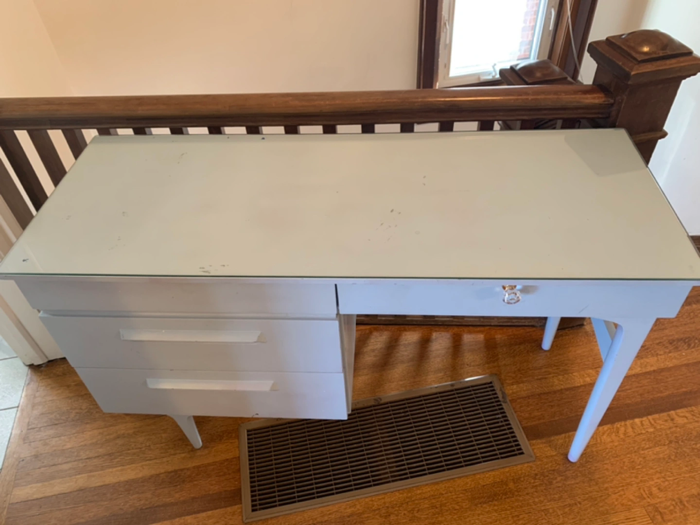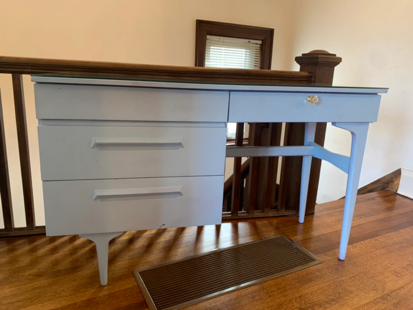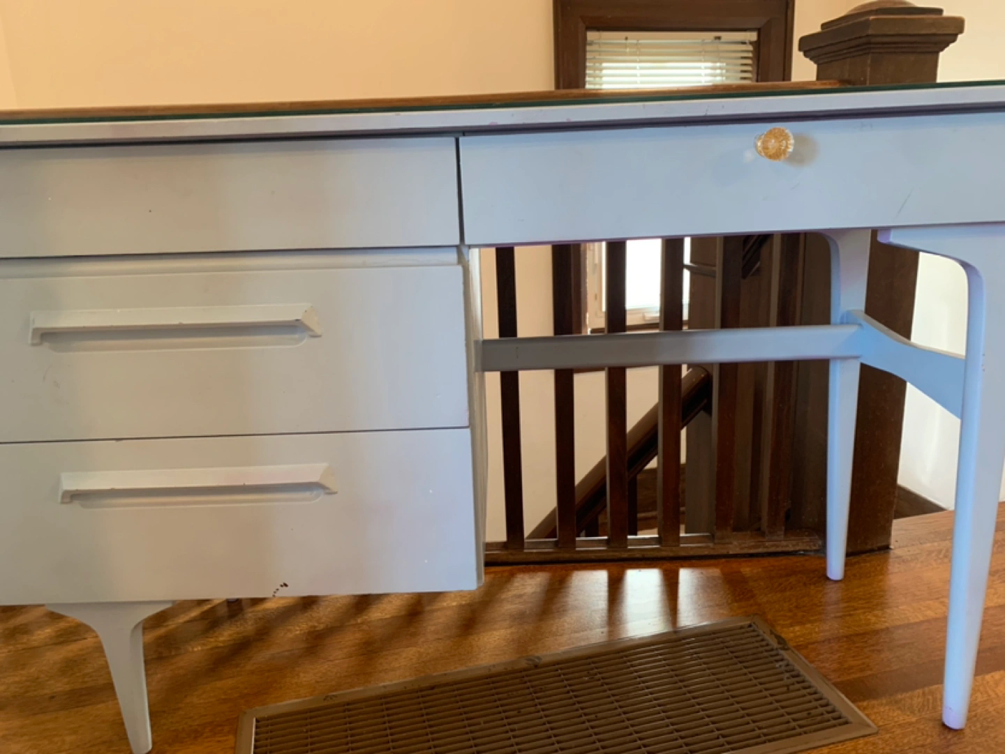 Beautifully redone desk, perfect for a child of any age. Baby blue finish with delicate knob for elegant design with a glass top. 49in Wide x 18in Deep