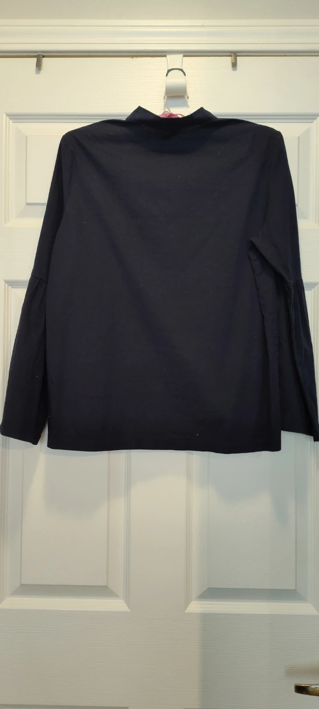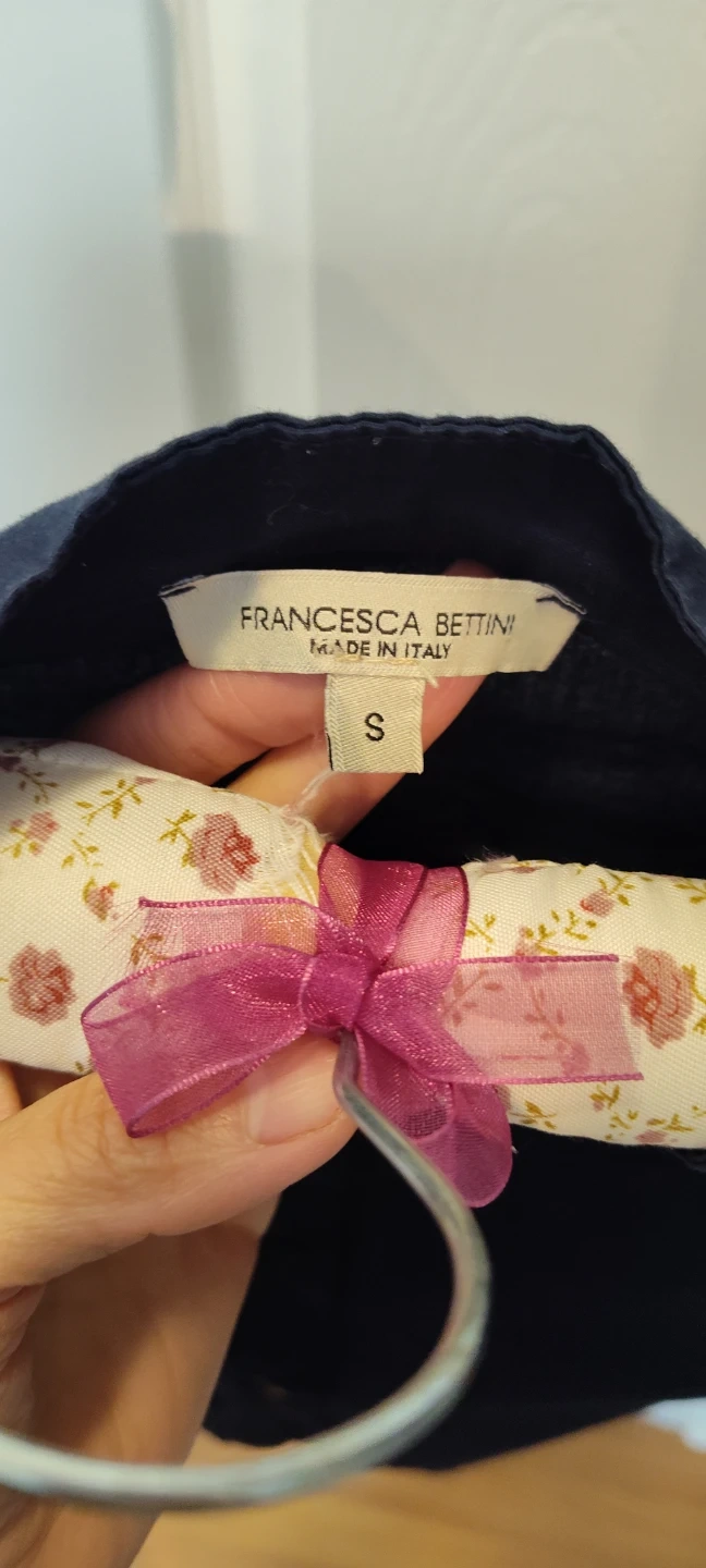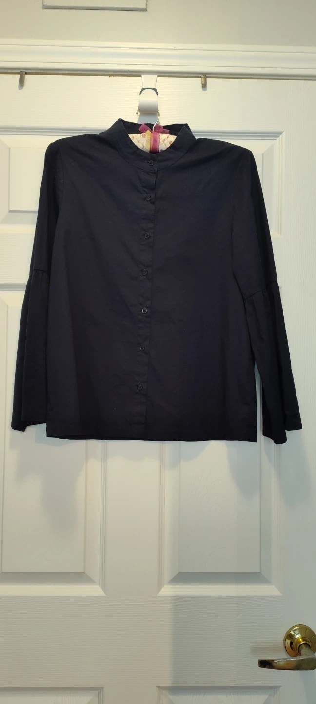 This is a navy blue button-up shirt from Francesca Bettini. It's made in Italy and features bell sleeves. Size is small.