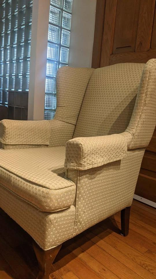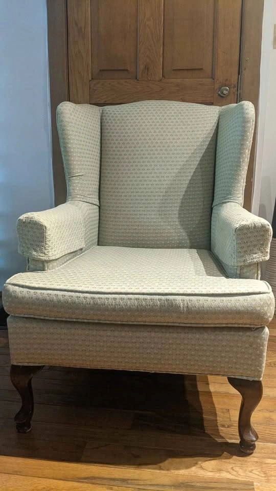 x2 Green Vintage Upholstered Wing Back Chairs - Cherry