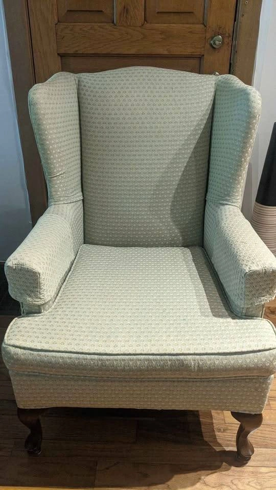 x2 Green Vintage Upholstered Wing Back Chairs - Cherry